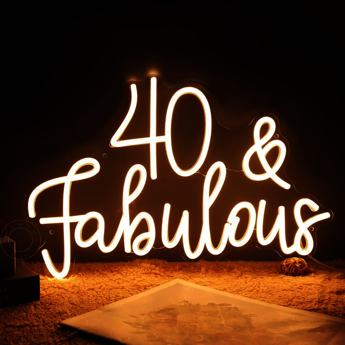 Le Néon 40 & Fabulous affiche le message “40 & Fabulous” dans une typographie manuscrite élégante et lumineuse.