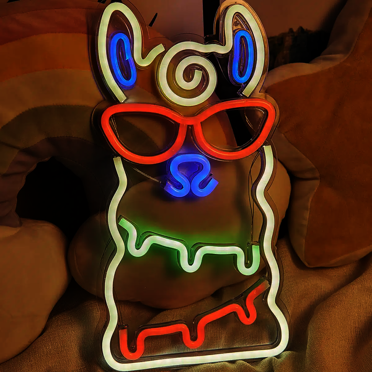 Les détails colorés, comme ses oreilles bleues et les lignes vertes et rouges qui le décorent, font de ce néon une œuvre d’art murale lumineuse et joyeuse.