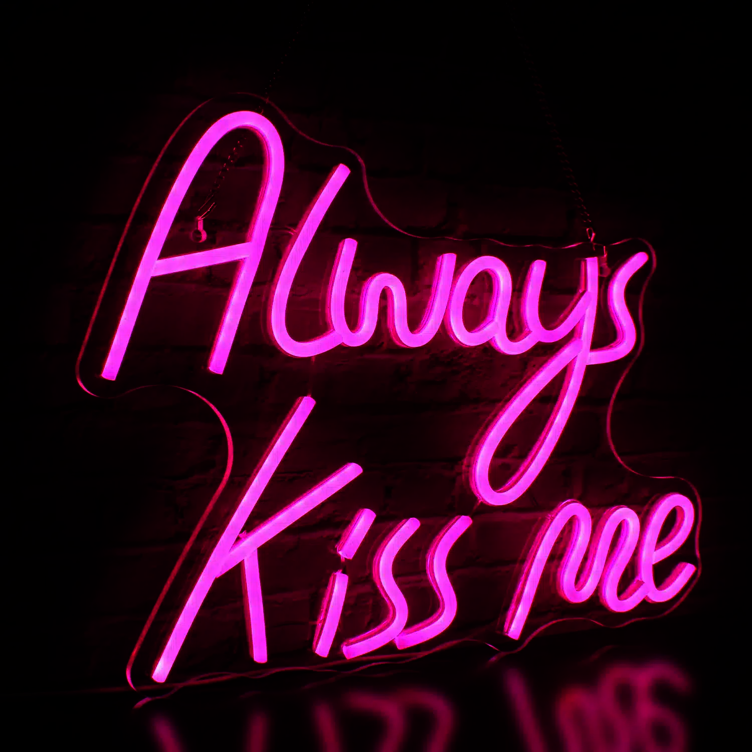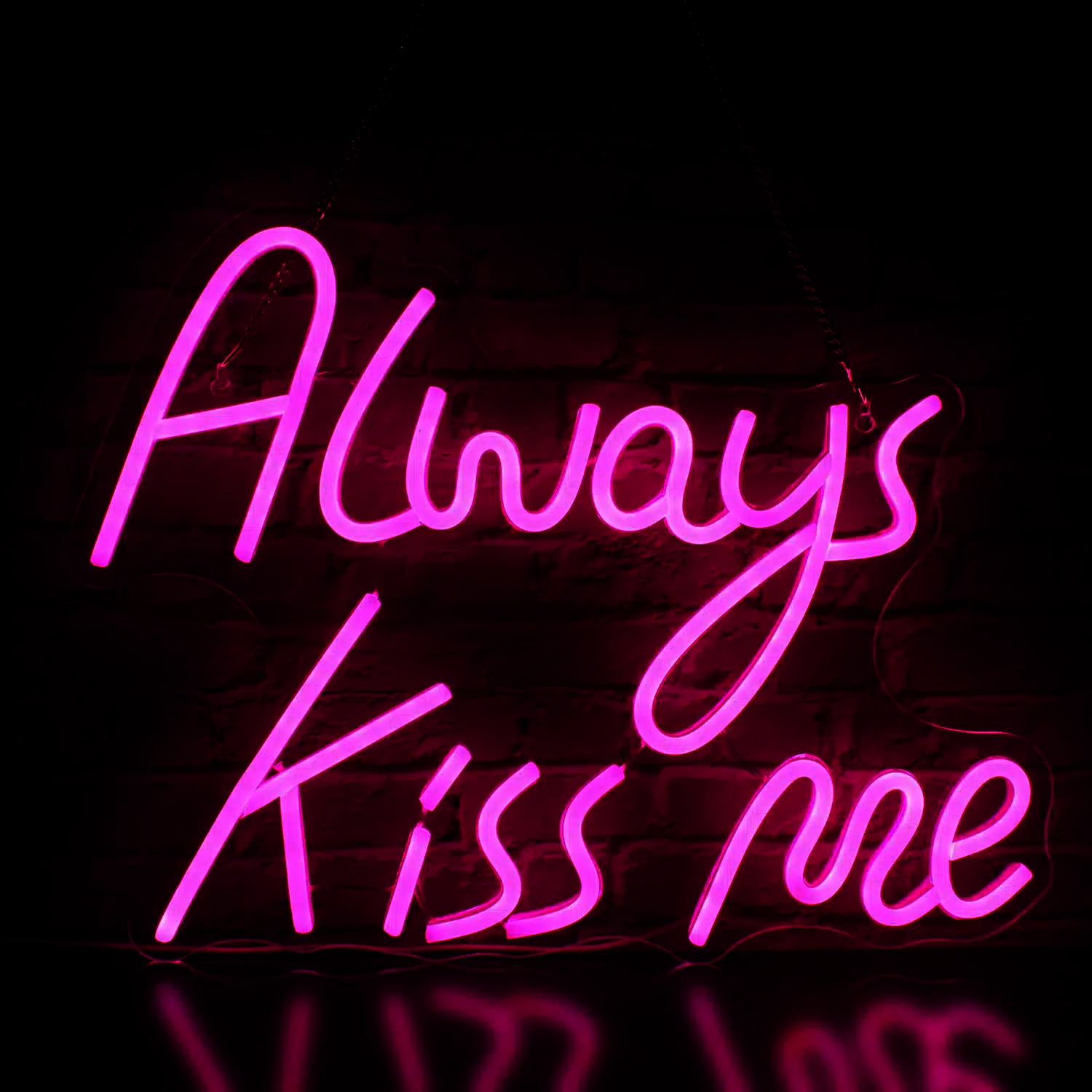 Le Néon Always Kiss me affiche une déclaration romantique et séduisante en lettres lumineuses roses.