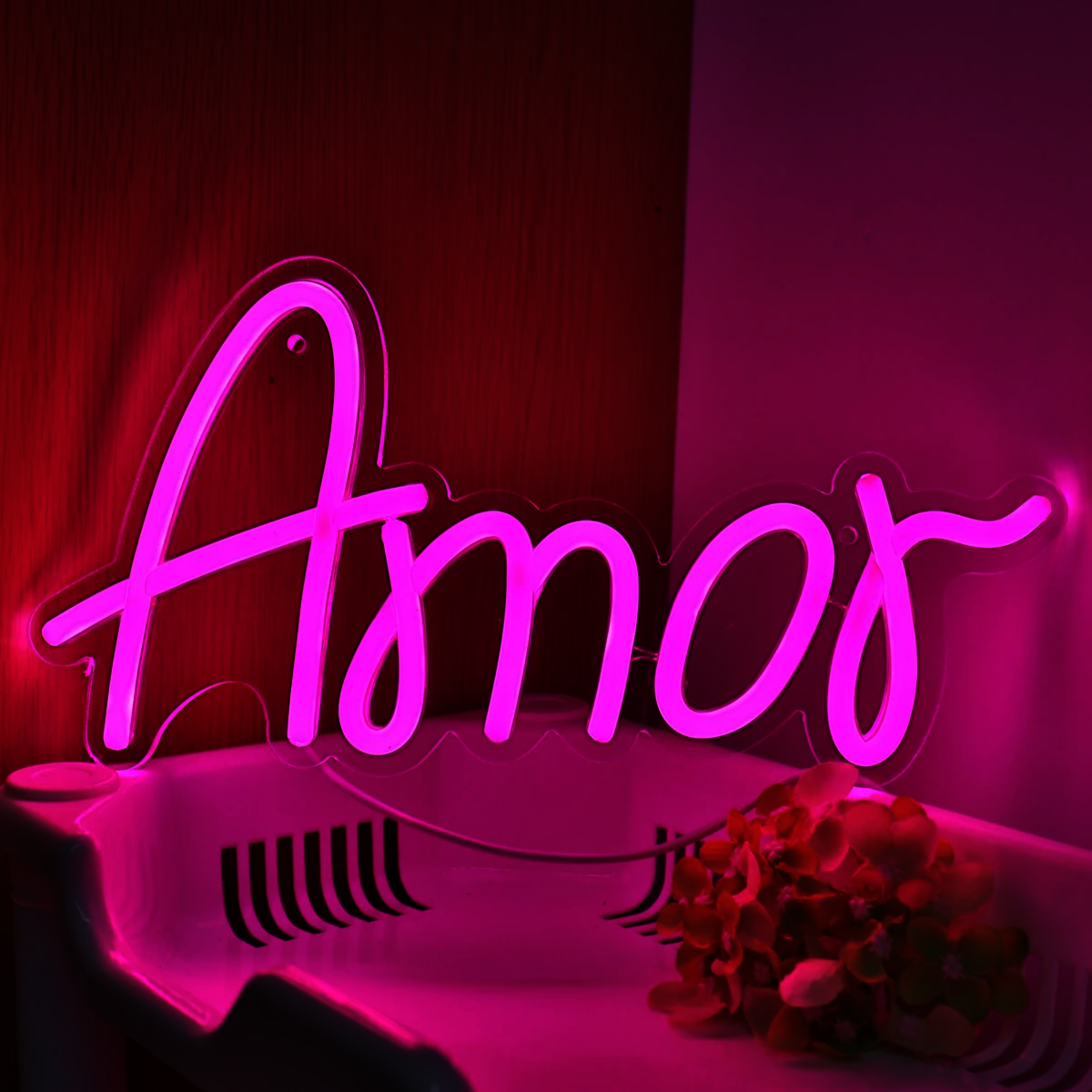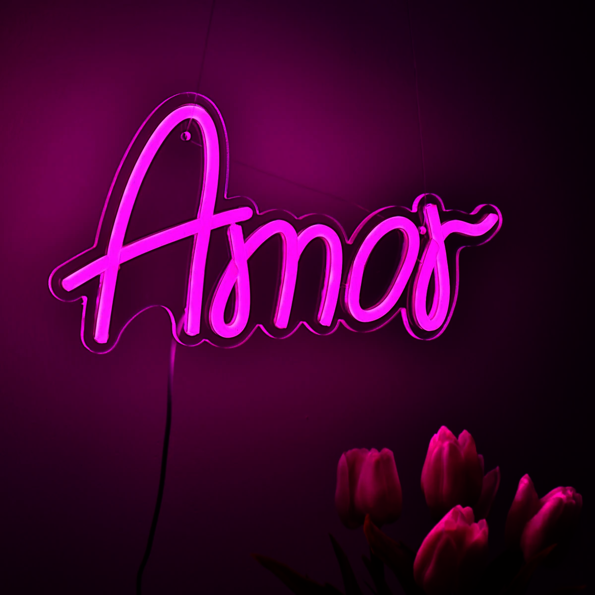 Le Néon Amor représente le mot “Amor” écrit en élégante calligraphie cursive, illuminé par une lumière rose vif.