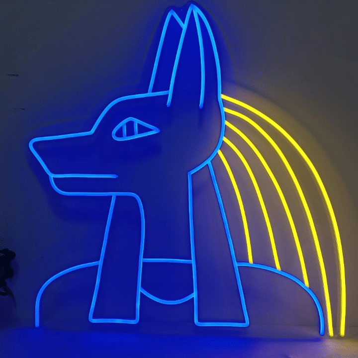 Le Néon Anubis représente la divinité égyptienne à tête de chacal, gardien des morts et guide vers l’au-delà dans la mythologie de l’Égypte antique.