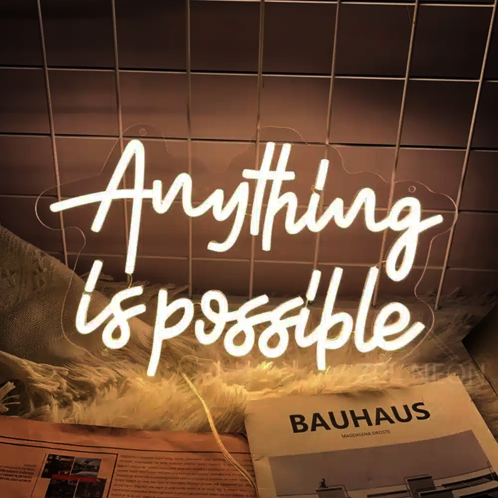 Le Néon Anything is possible affiche un message inspirant en lettres cursives lumineuses.