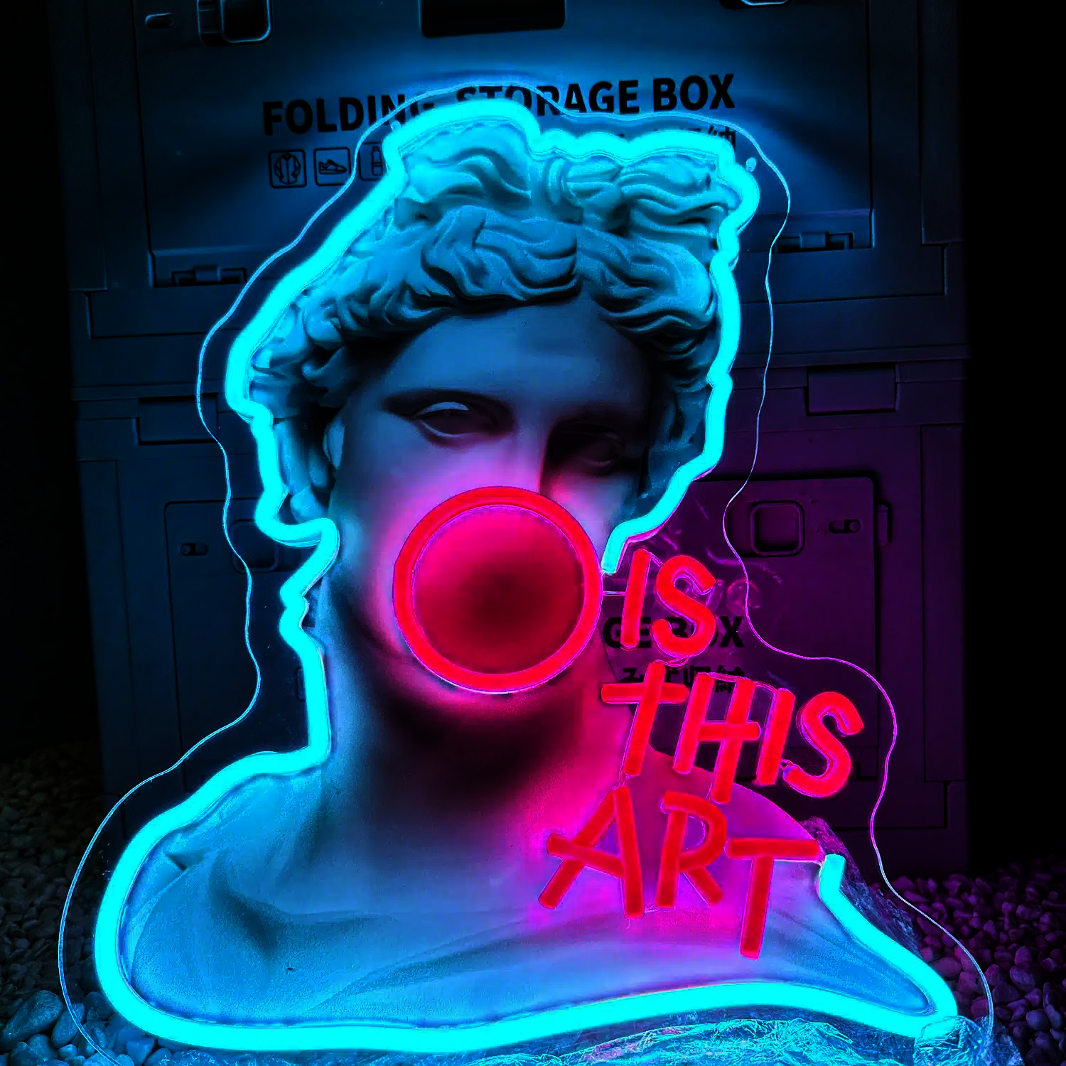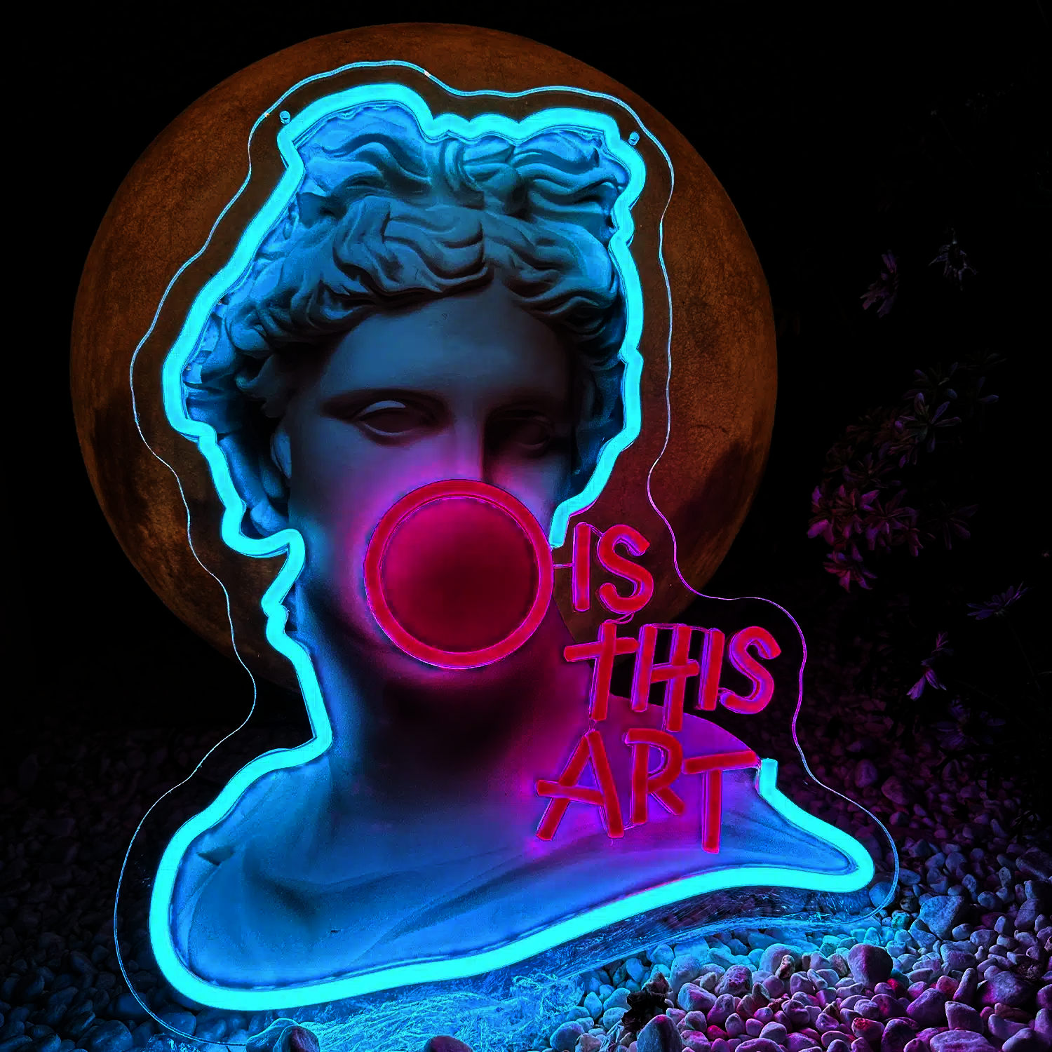 Le Néon Apollon Is This Art représente le buste de l’Apollon du Belvédère, célèbre sculpture antique grecque datant du IVe siècle avant J.-C., avec une bulle de chewing-gum rose vif qui sort de sa bouche.
