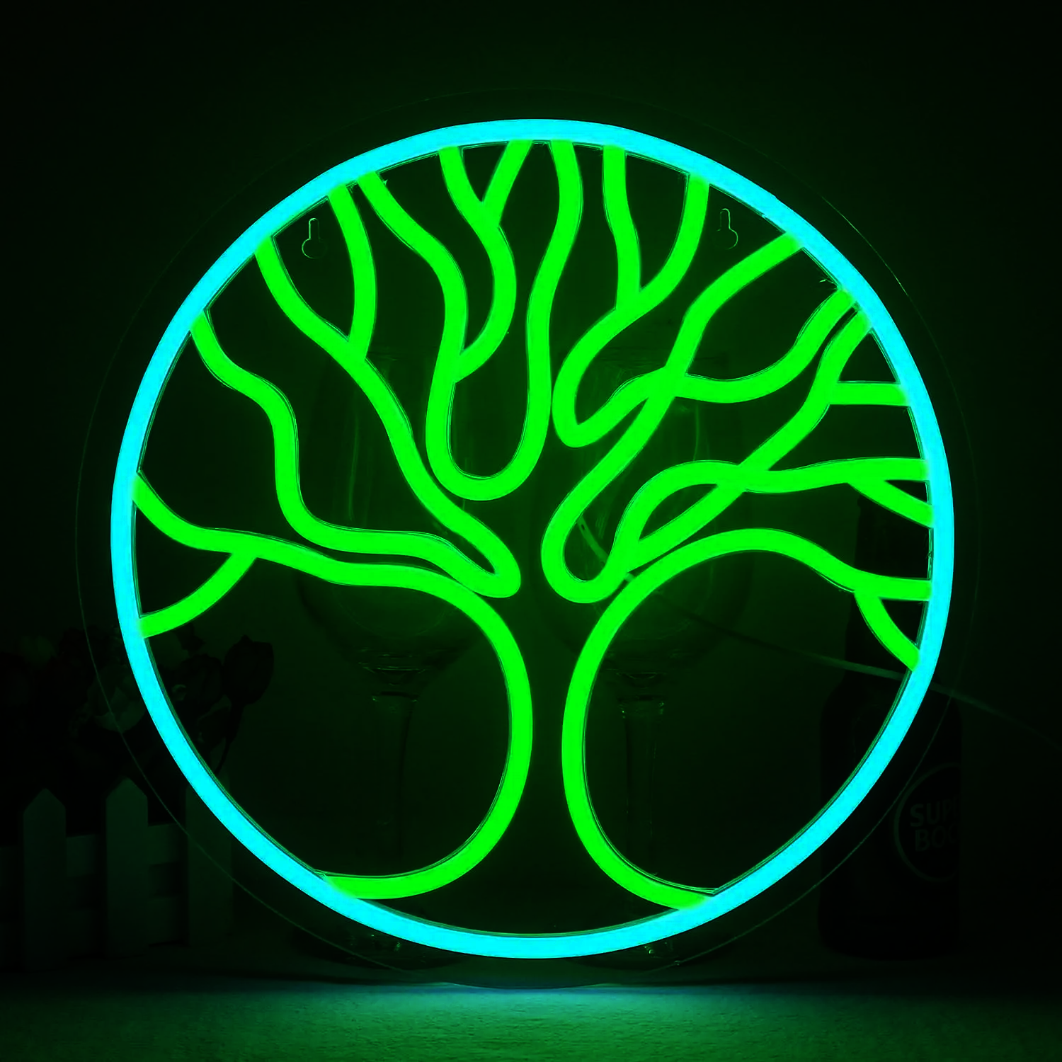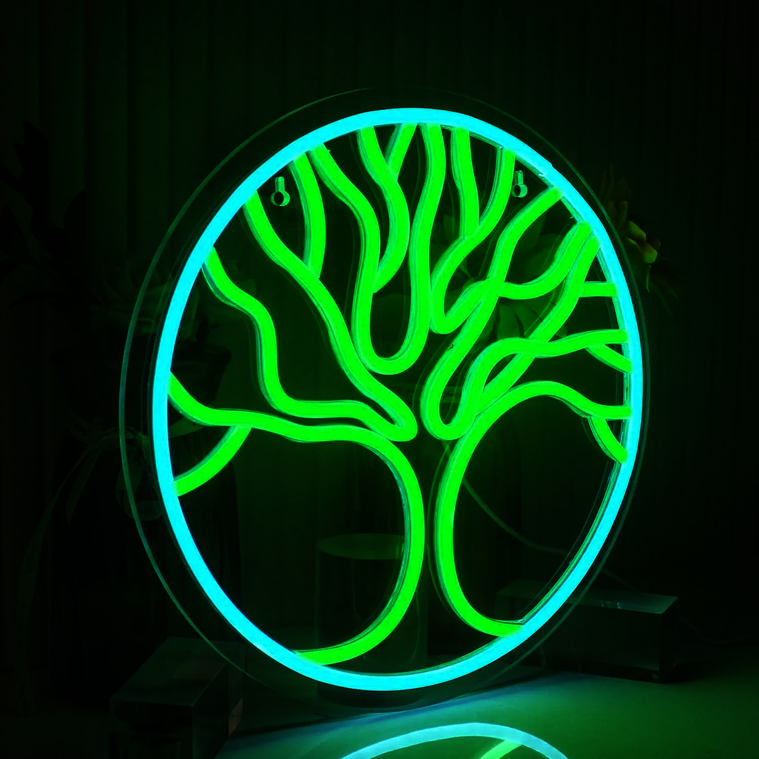 Le Néon Arbre de Vie représente un arbre stylisé aux branches sinueuses contenu dans un cercle parfait, le tout illuminé d’une intense couleur verte émeraude avec un contour bleu turquoise.