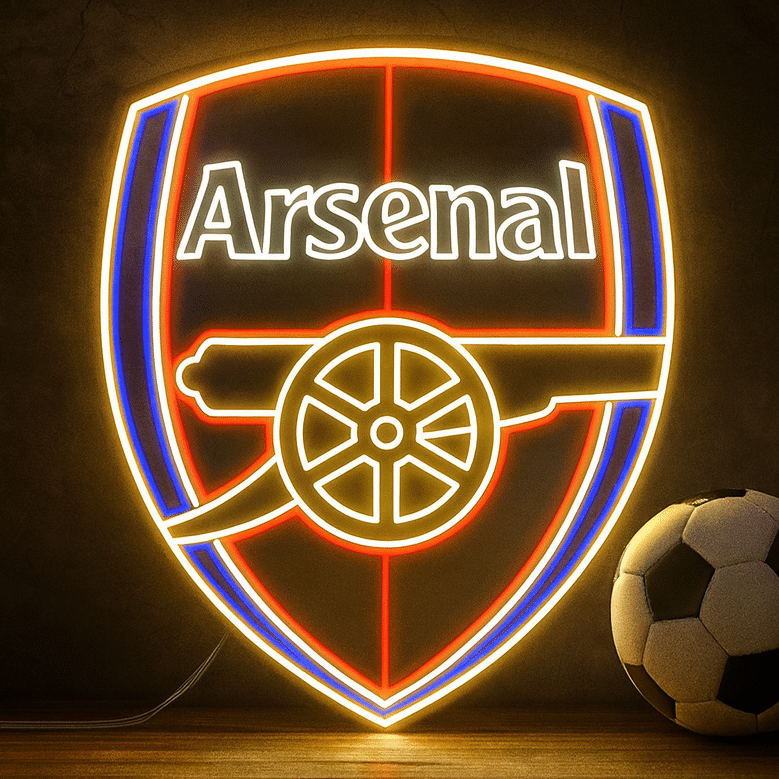 Le Néon Arsenal FC reproduit fidèlement le blason officiel du célèbre club de football londonien, avec son écusson caractéristique en forme de bouclier.
