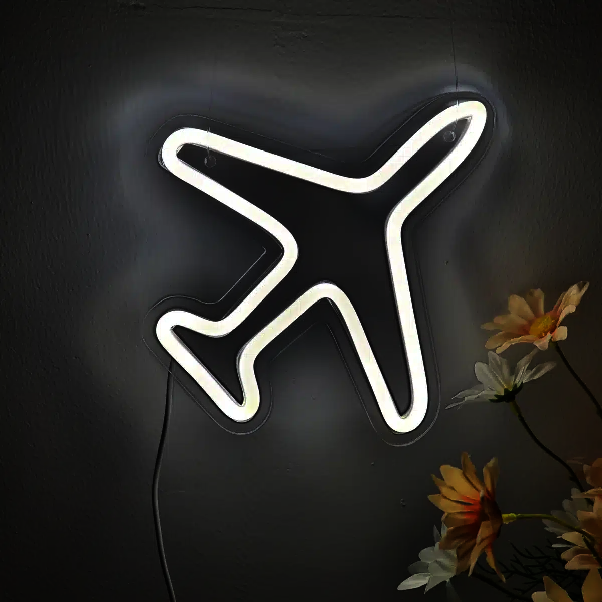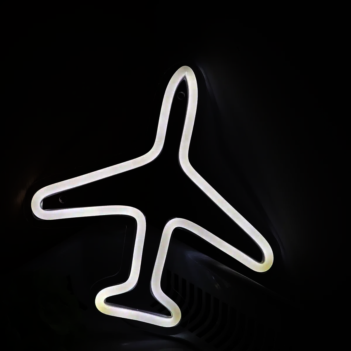 L’apparence épurée du néon forme les contours nets d’un avion, avec des ailes distinctes, un fuselage allongé et des réacteurs stylisés aux extrémités des ailes.