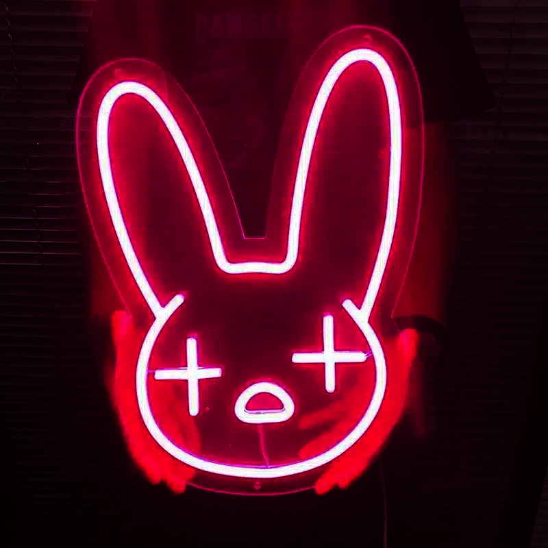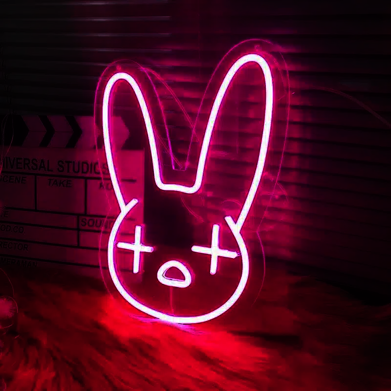 Le Néon Bad Bunny représente le logo emblématique du célèbre rappeur portoricain : un lapin rose aux longues oreilles dressées, arborant des croix à la place des yeux.