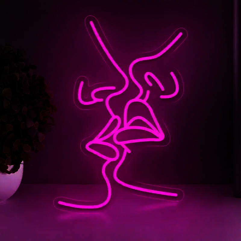 Le Neon Baiser est un néon lumineux représentant deux demi-visages féminins se rapprochant pour un baiser sensuel.