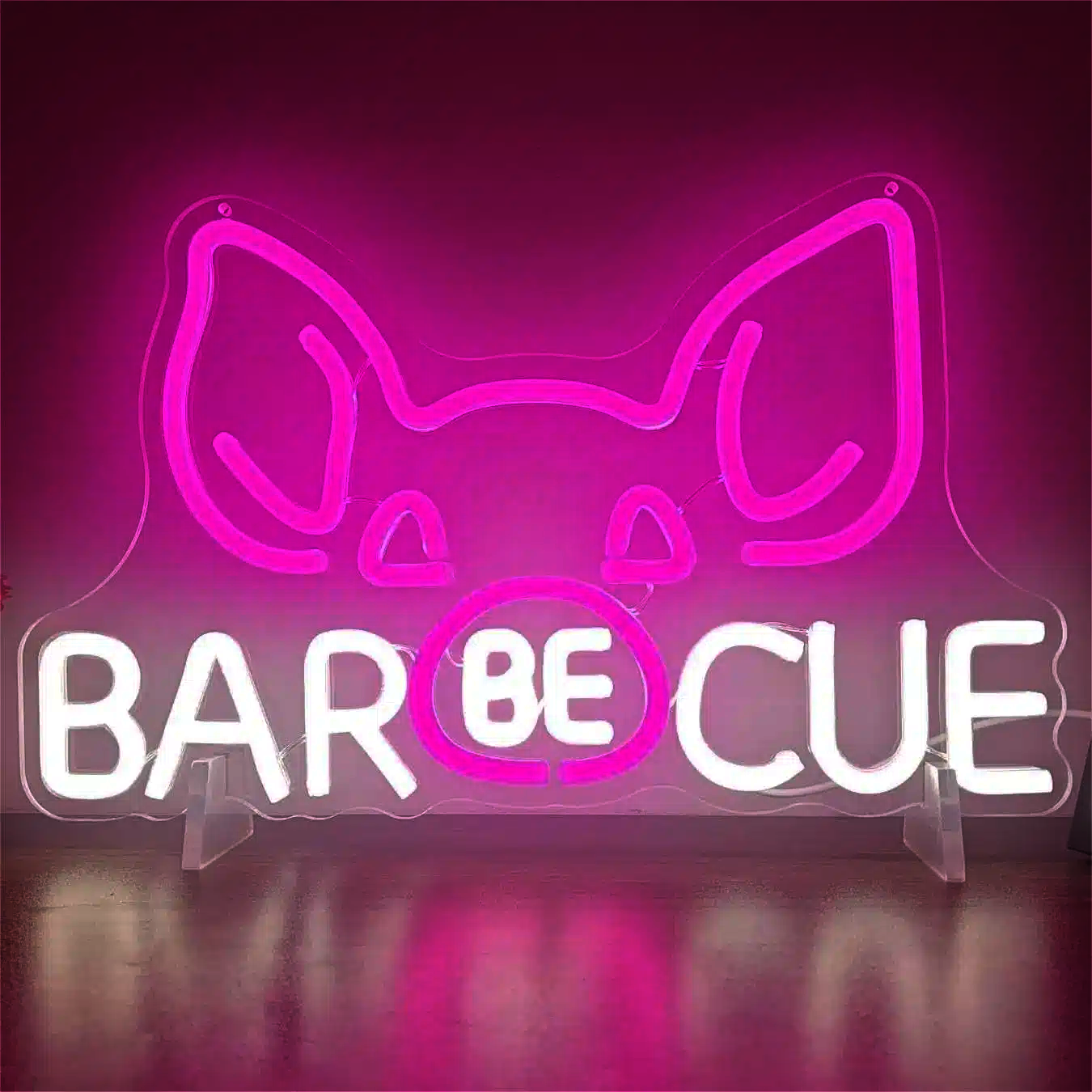 Le mot “BARBECUE” est écrit en lettres majuscules blanches lumineuses, contrastant avec le rose de la tête de cochon. Les lettres “BE” au milieu du groin créent un effet intéressant.