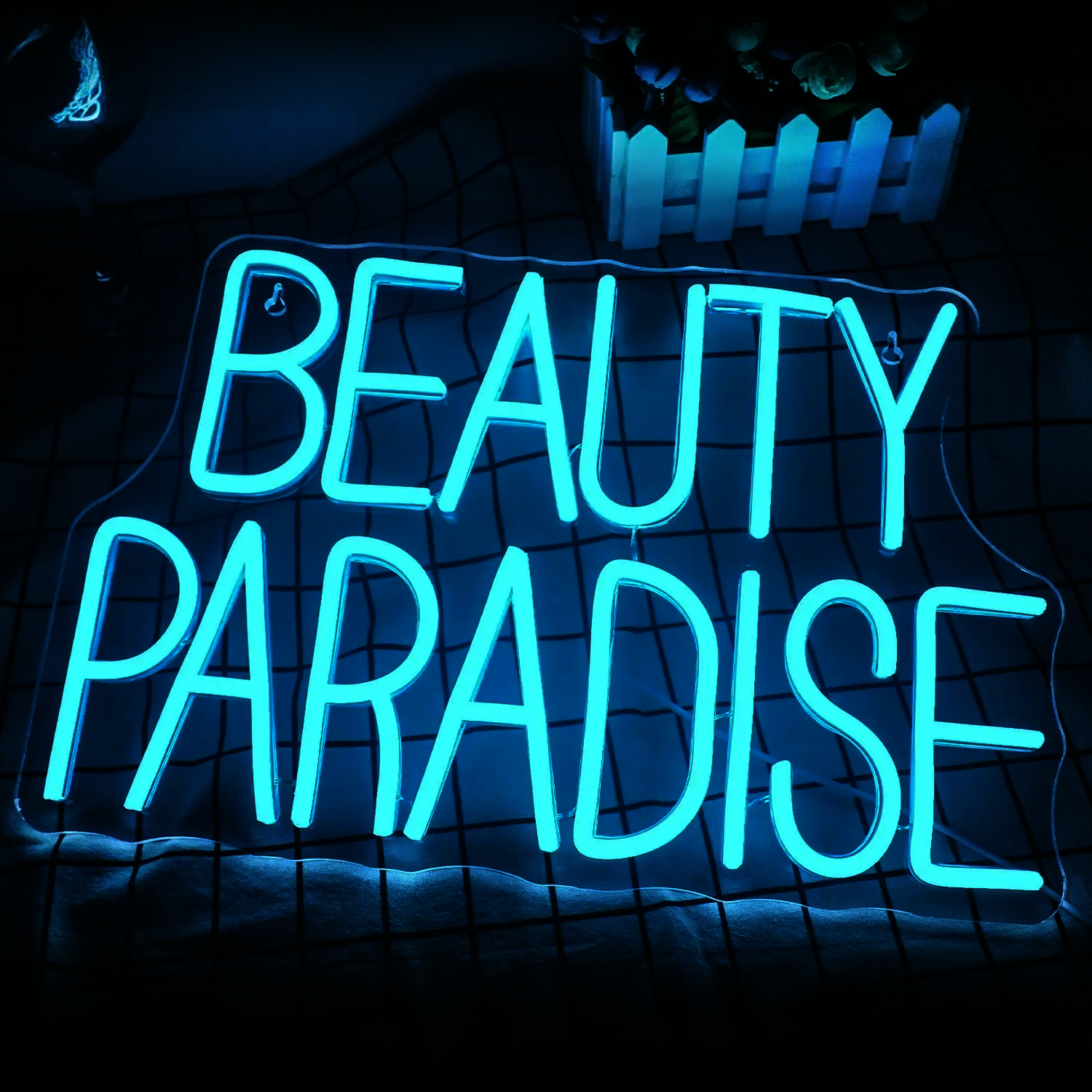 Plongez dans un univers de beauté paradisiaque avec ce néon élégant. Ses lettres lumineuses bleues “BEAUTY PARADISE” créent une ambiance chic et moderne, parfaite pour les espaces dédiés au bien-être et à l’esthétique.