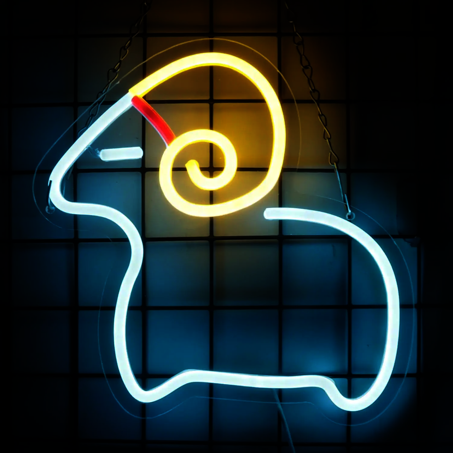 Ce néon affiche les contours d’un animal au corps arrondi, évoquant la forme d’un bélier avec sa caractéristique corne en spirale qui se démarque par sa couleur jaune vif contrastant avec le reste du corps blanc.