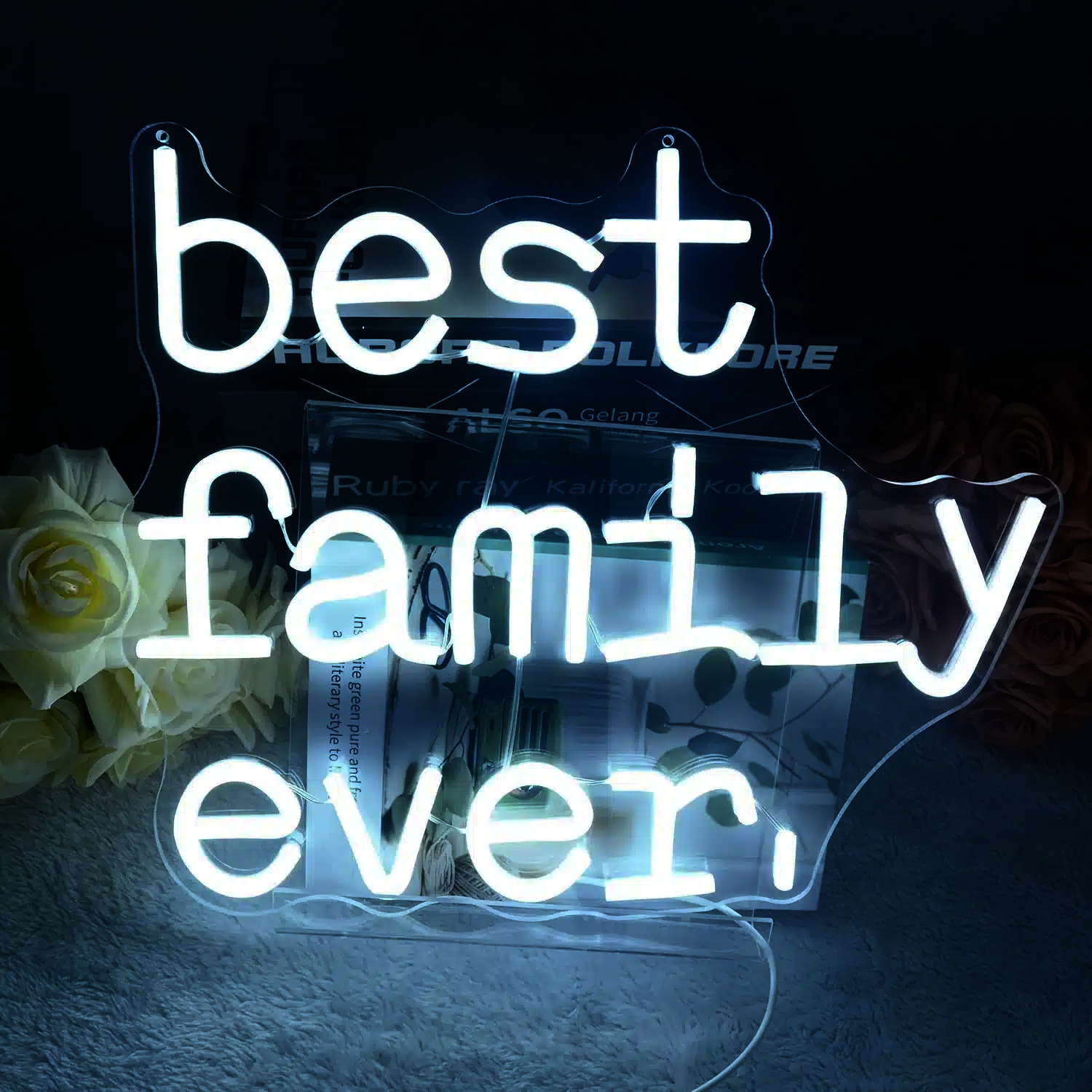 Célébrez votre tribu avec le néon Best Family Ever, affichant “meilleure famille du monde” en lettres cursives blanches lumineuses sur trois lignes élégantes.