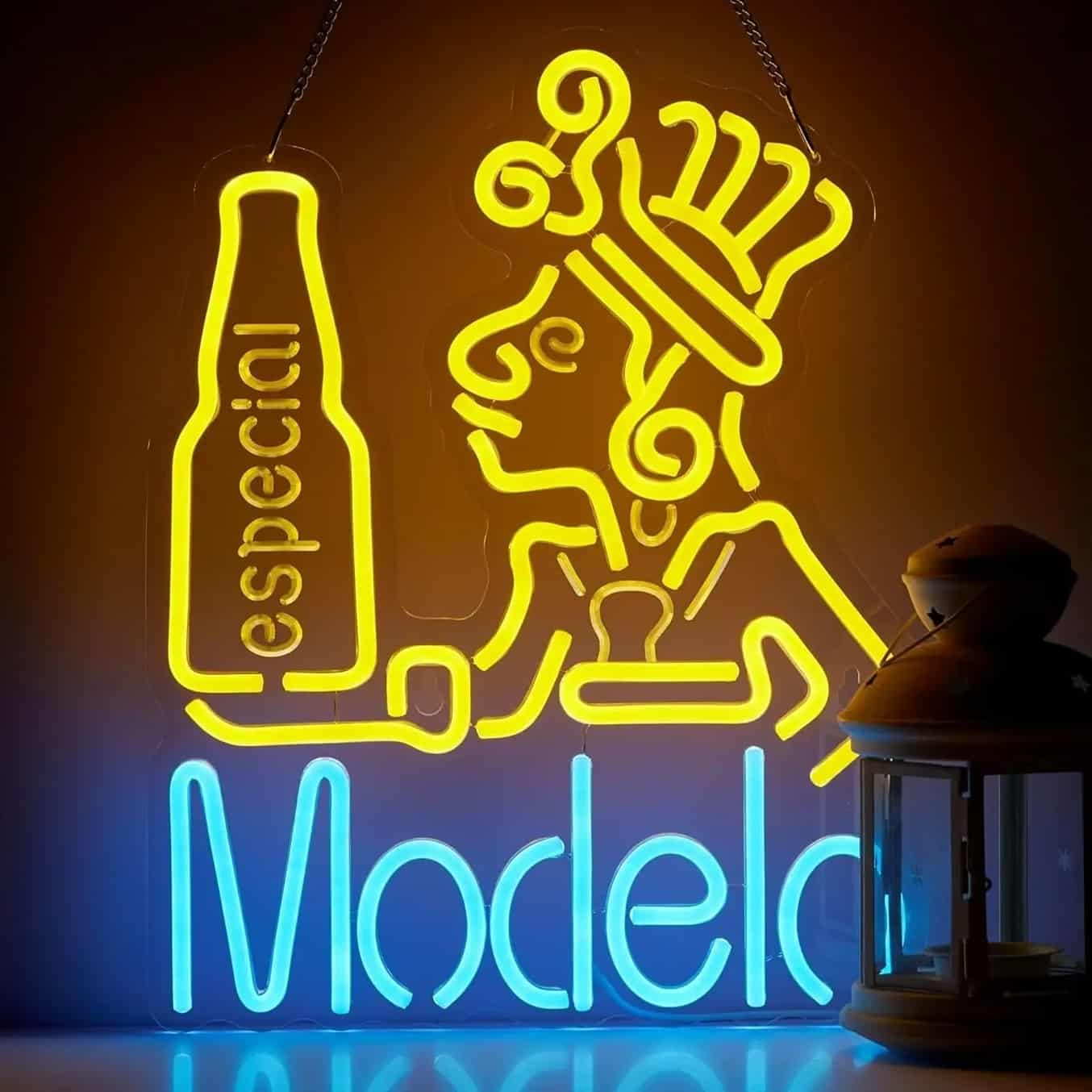Le Néon Bière Modelo Especial reproduit fidèlement le logo emblématique de cette bière mexicaine premium, avec une bouteille jaune néon accompagnée du profil stylisé d’un personnage aztèque portant une coiffe traditionnelle.