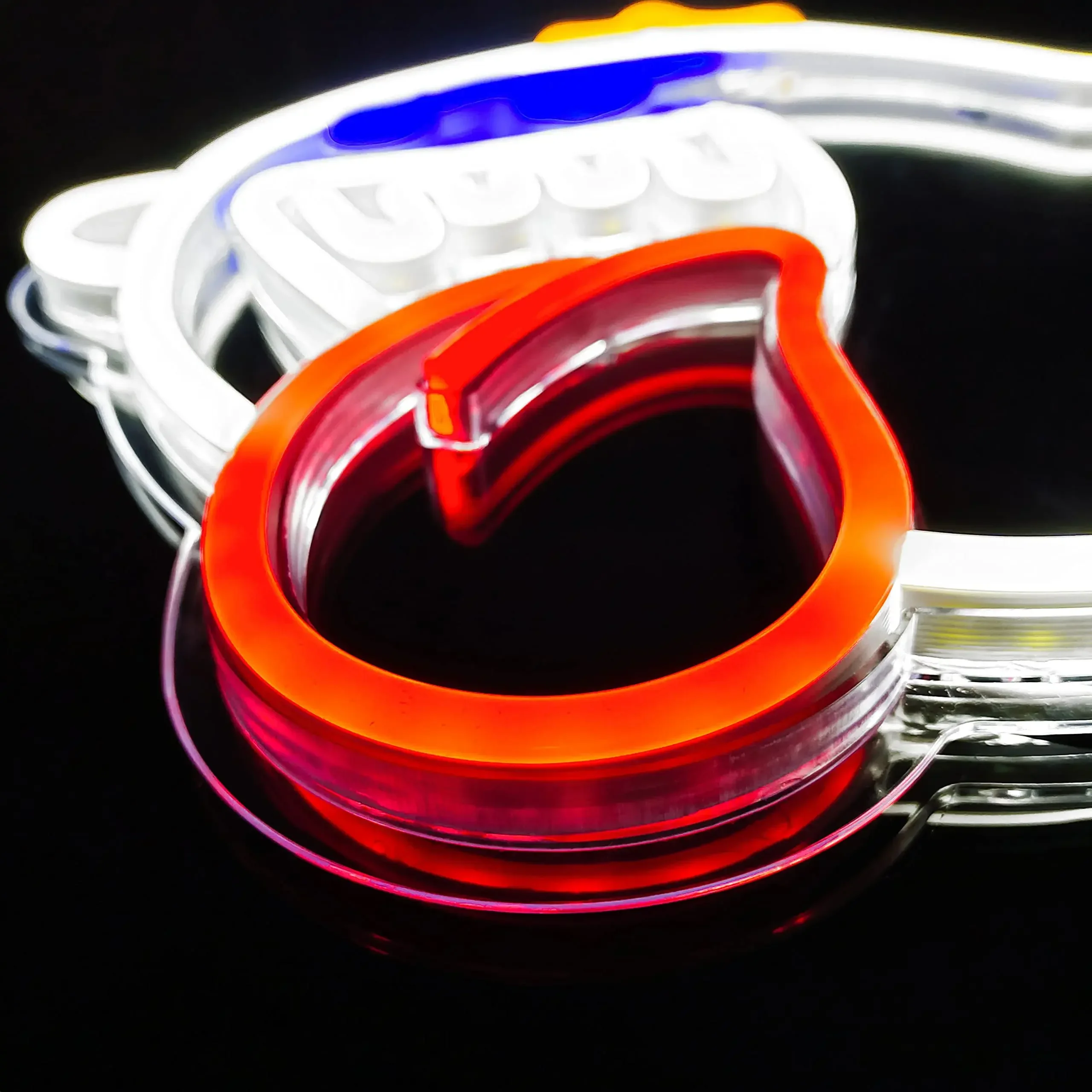 Ce néon affiche King Boo dans sa forme classique de fantôme rond au contour blanc/gris, surmonté de sa couronne jaune or étincelante. Il a la bouche grande ouverte, laissant voir une rangée de dents blanches aiguisées et une langue rouge vive tirée vers le bas, accentuant son air joueur et taquin. Ses yeux sont représentés par des lignes bleues tombantes, lui donnant un air à la fois fatigué et mystérieux.