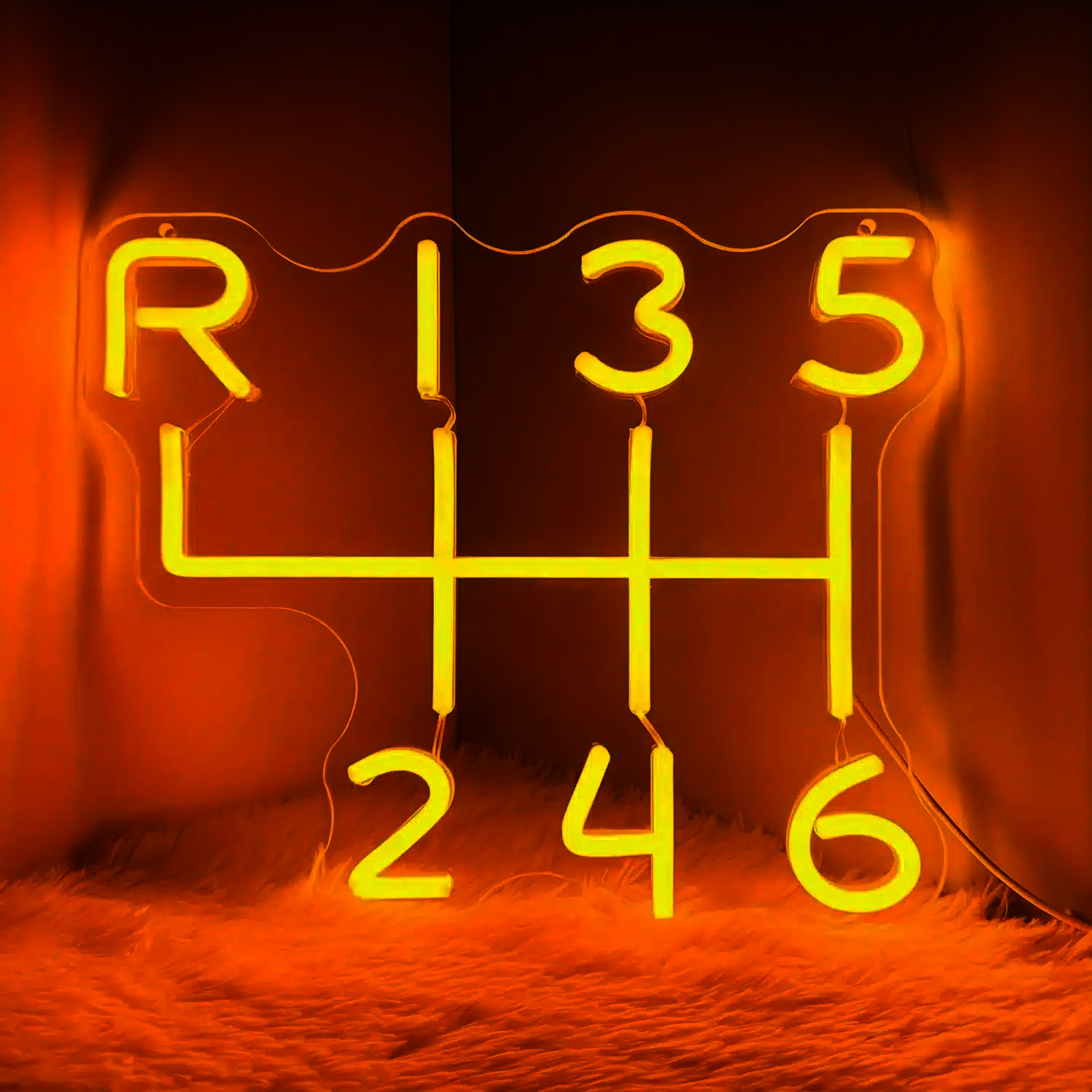 Ce néon affiche le motif classique d’une grille de changement de vitesse à 6 rapports, avec les chiffres “1”, “3”, “5” sur la rangée supérieure et “2”, “4”, “6” sur la rangée inférieure. La lettre “R” pour “Reverse” (marche arrière) est placée en haut à gauche.