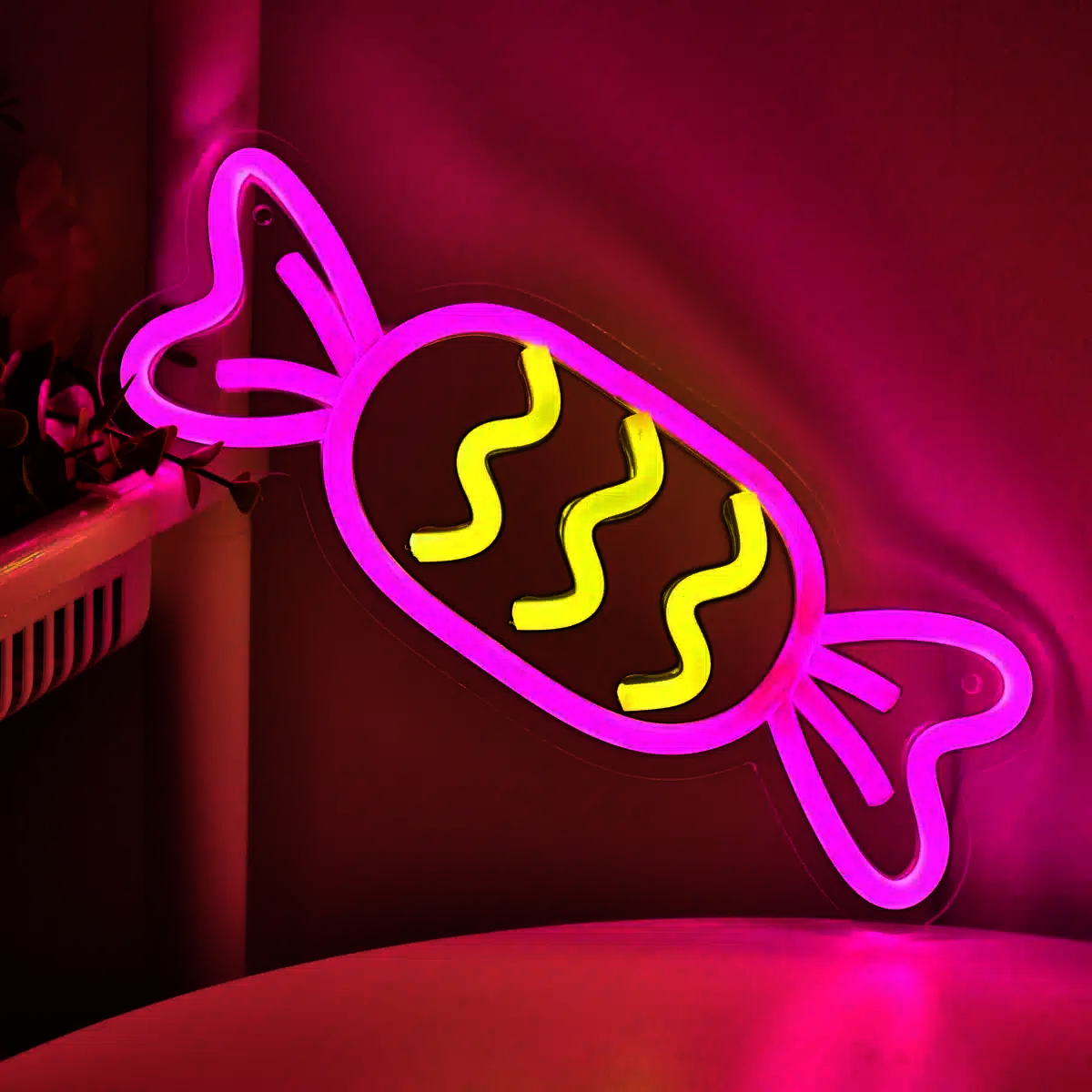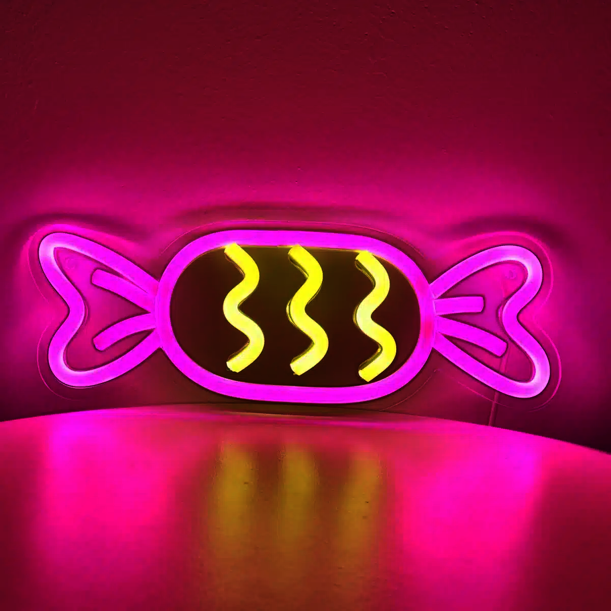 La silhouette du Néon Bonbon est reconnaissable au premier coup d’œil, avec ses extrémités torsadées qui suggèrent la façon dont on ouvre ces petites douceurs.