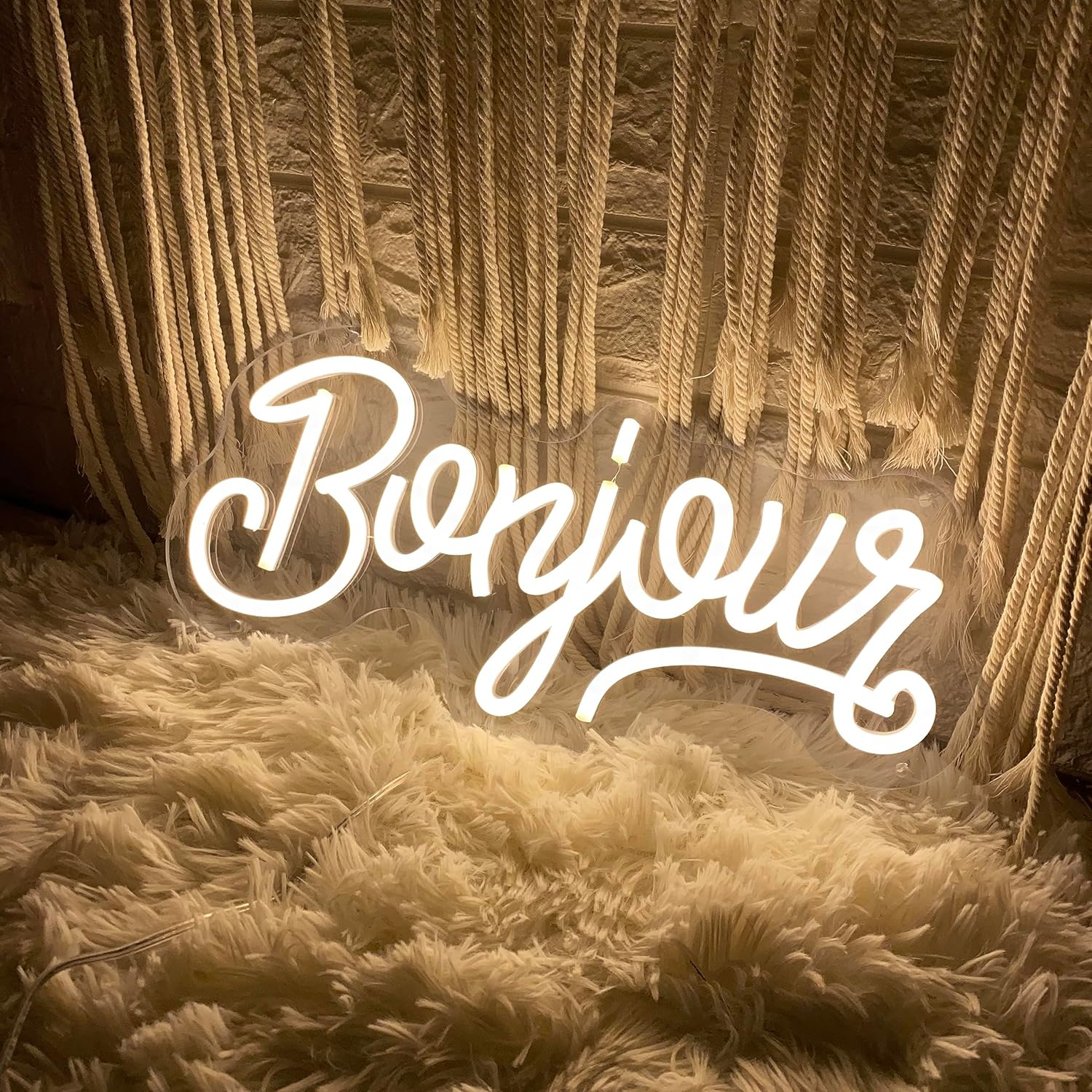 Le Néon Bonjour affiche le mot “Bonjour” en une écriture manuscrite douce et chaleureuse.