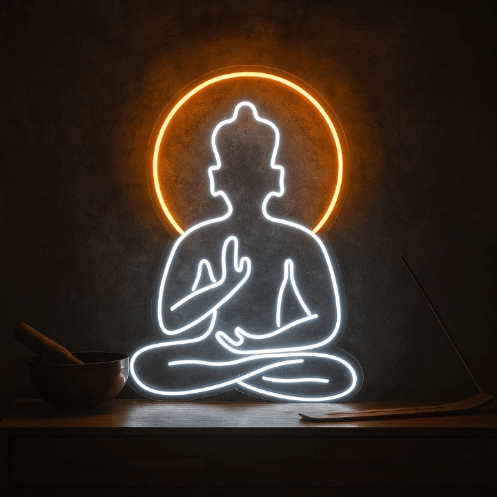 Le Néon Bouddha représente une silhouette de Bouddha en position de méditation, avec une main levée dans un geste de bénédiction et les jambes croisées en lotus.
