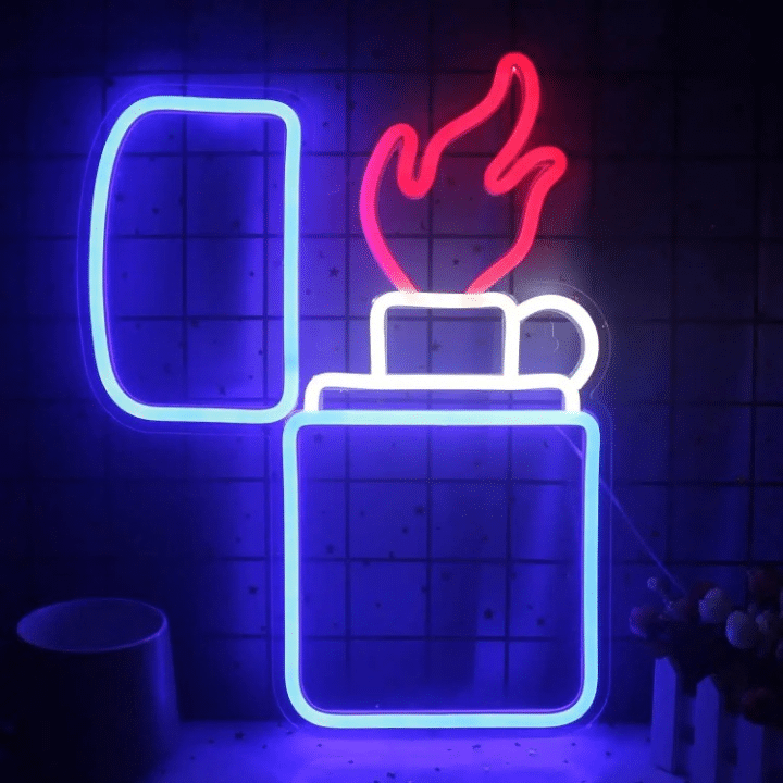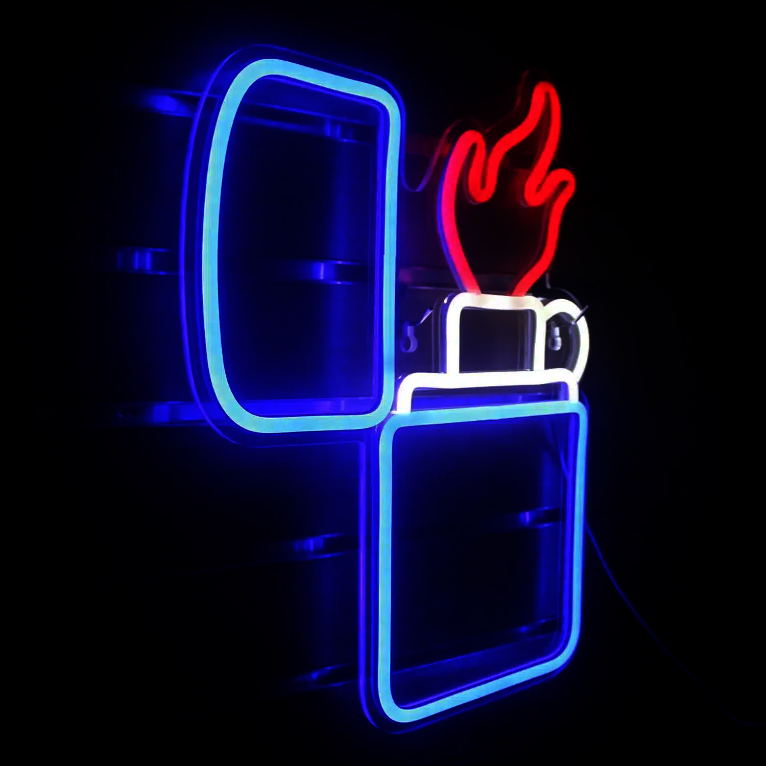 Ce néon se compose de trois parties distinctes : un contour bleu clair formant le corps rectangulaire du briquet, une flamme rouge vif jaillissant du haut, et le mécanisme d’allumage représenté en blanc.