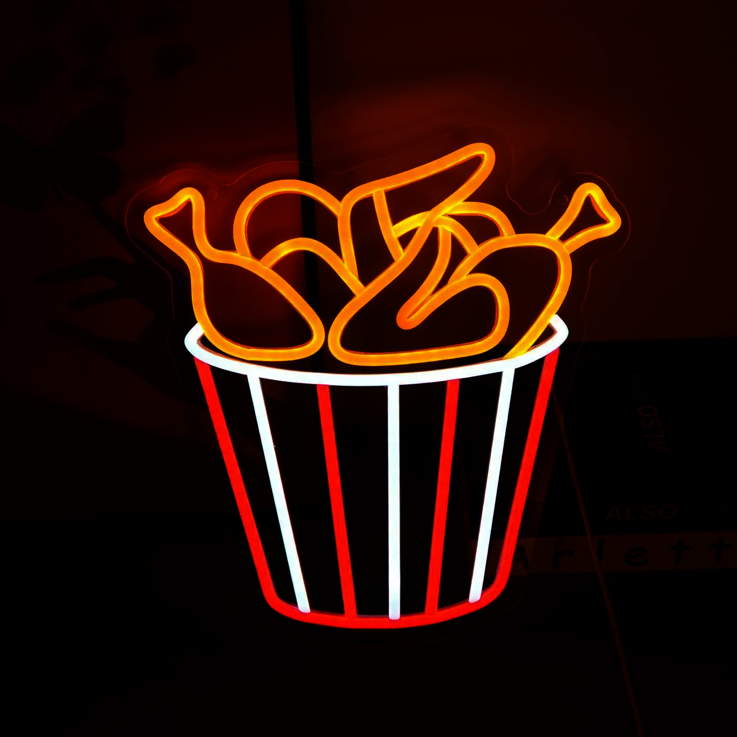 Le Néon Bucket Wings affiche un seau rayé verticalement en rouge et blanc, évoquant l’image classique des seaux de poulet frit popularisés par les chaînes de restauration rapide, comme KFC.