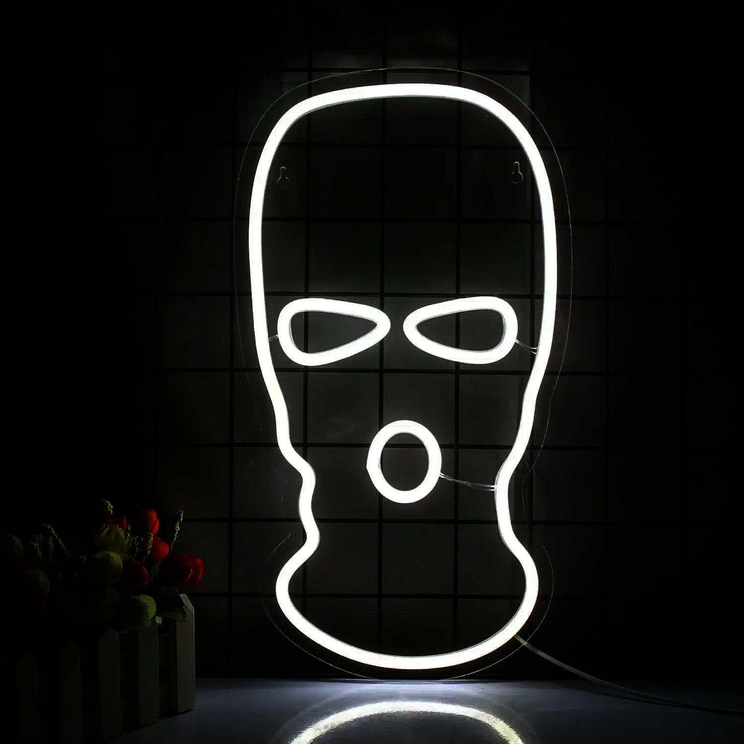 Ce néon affiche les contours épurés d’un visage masqué, avec deux fentes horizontales pour les yeux et une ouverture circulaire pour la bouche, créant une image à la fois mystérieuse et intrigante.