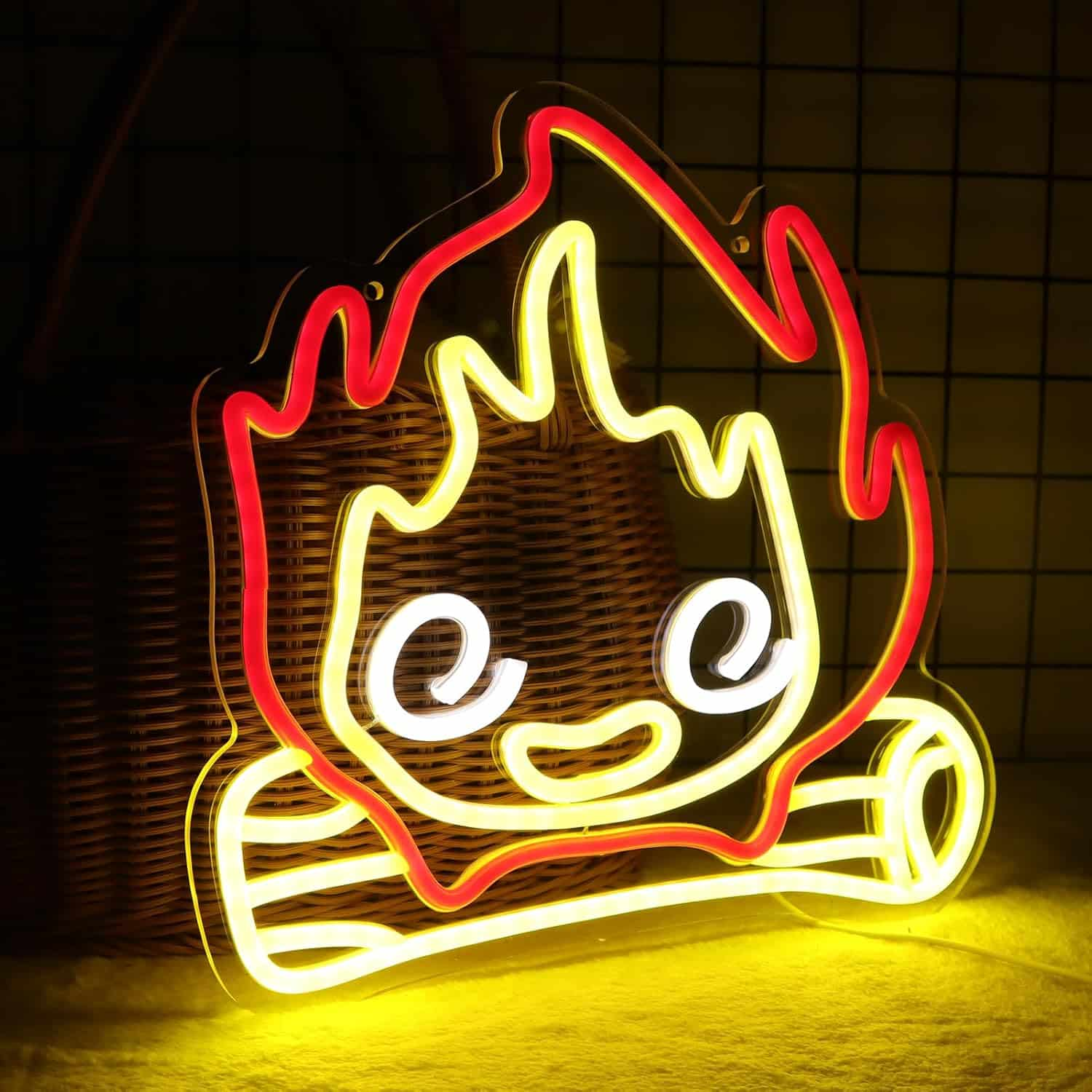 Revivez la magie du Château ambulant avec le Néon Calcifer, flamme orange et rouge ondulante aux grands yeux blancs expressifs, posée sur ses bûches jaunes caractéristiques.