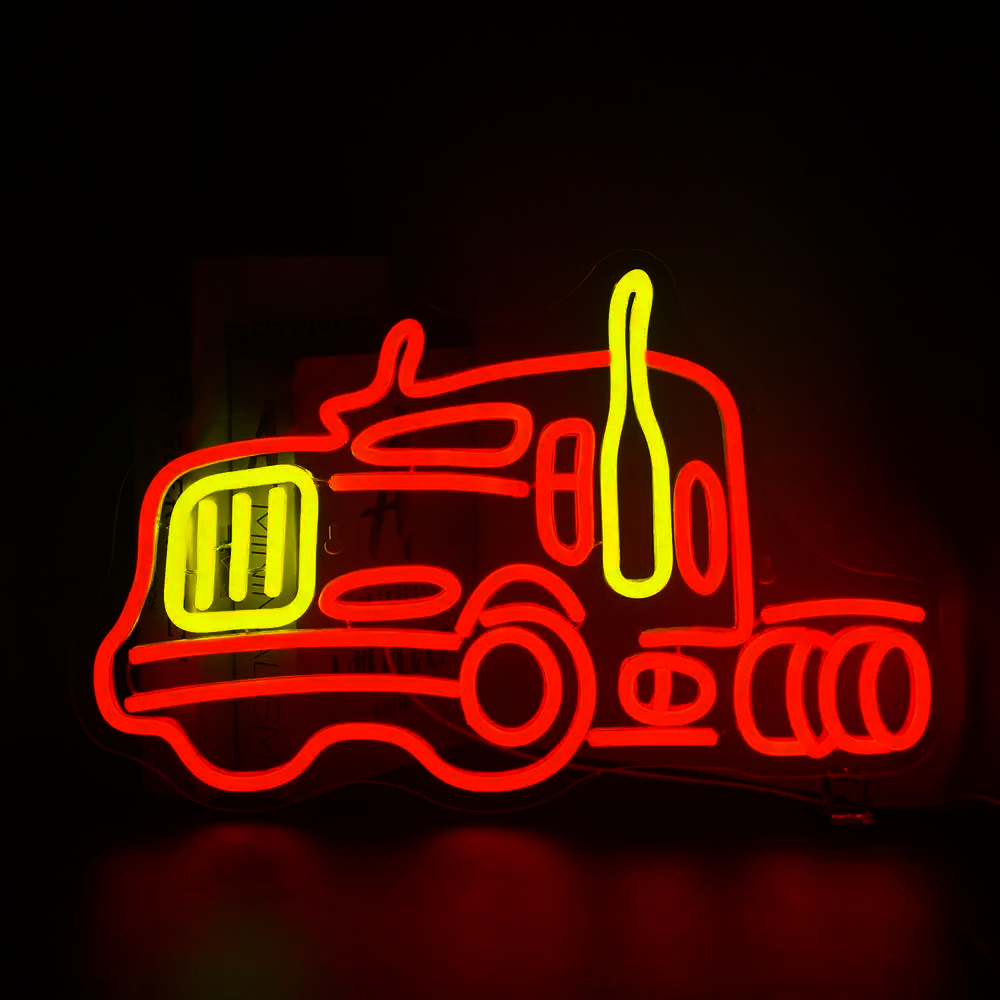 Ce néon lumineux dépeint le véhicule de profil, mettant en évidence ses lignes caractéristiques : une large cabine carrée à l’avant, suivie d’un long châssis qui suggère la présence d’une remorque.