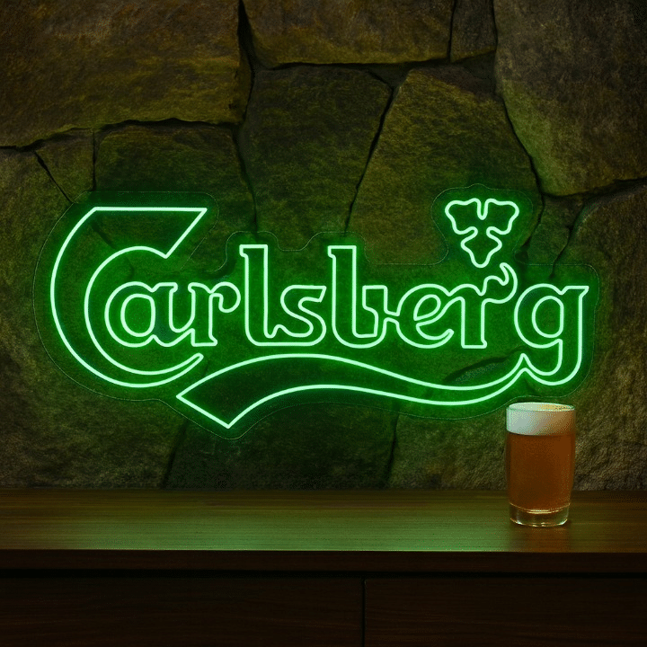 L’enseigne lumineuse affiche le nom “Carlsberg” en lettres cursives élégantes, accompagné du trèfle stylisé caractéristique de la marque, symbole de chance et d’authenticité.