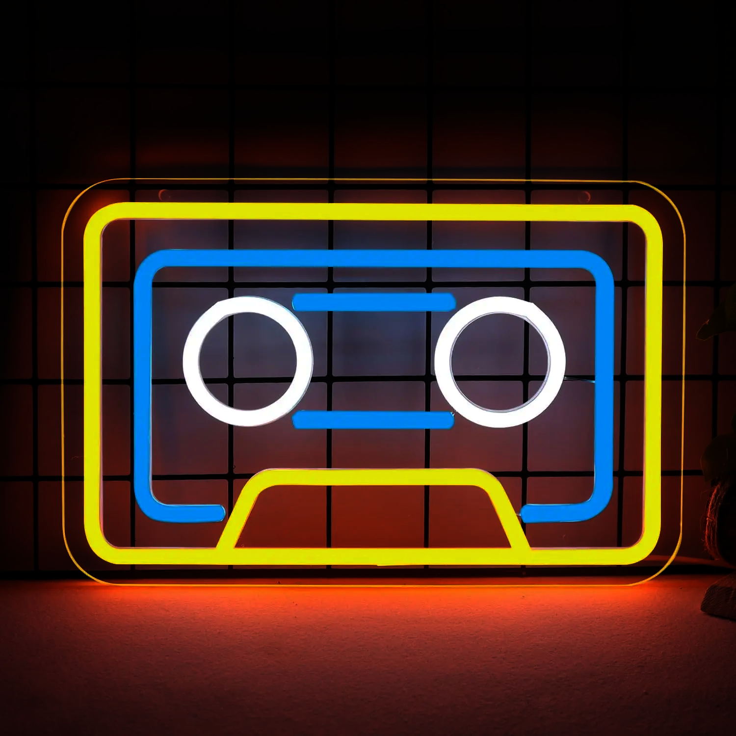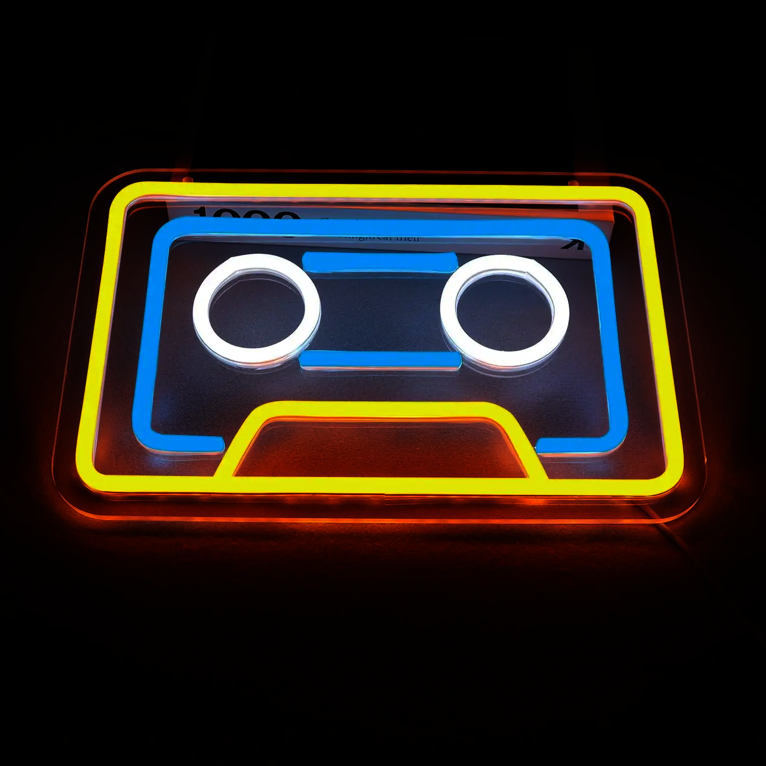 Ce néon présente un cadre extérieur jaune vif qui délimite parfaitement la forme emblématique de la cassette, tandis qu’un liseré bleu turquoise vient souligner les contours intérieurs pour créer un effet de profondeur visuel.