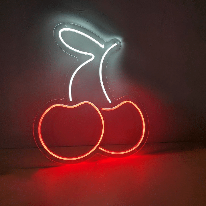 Le Néon Cerise représente une paire de cerises rouge vif, reliées par une tige blanche lumineuse.