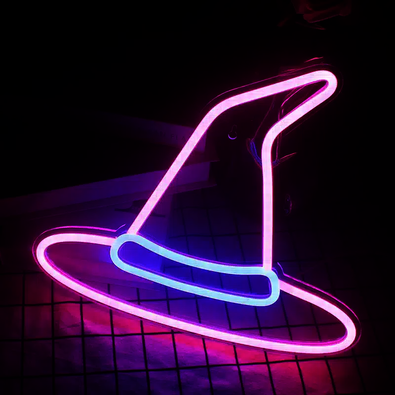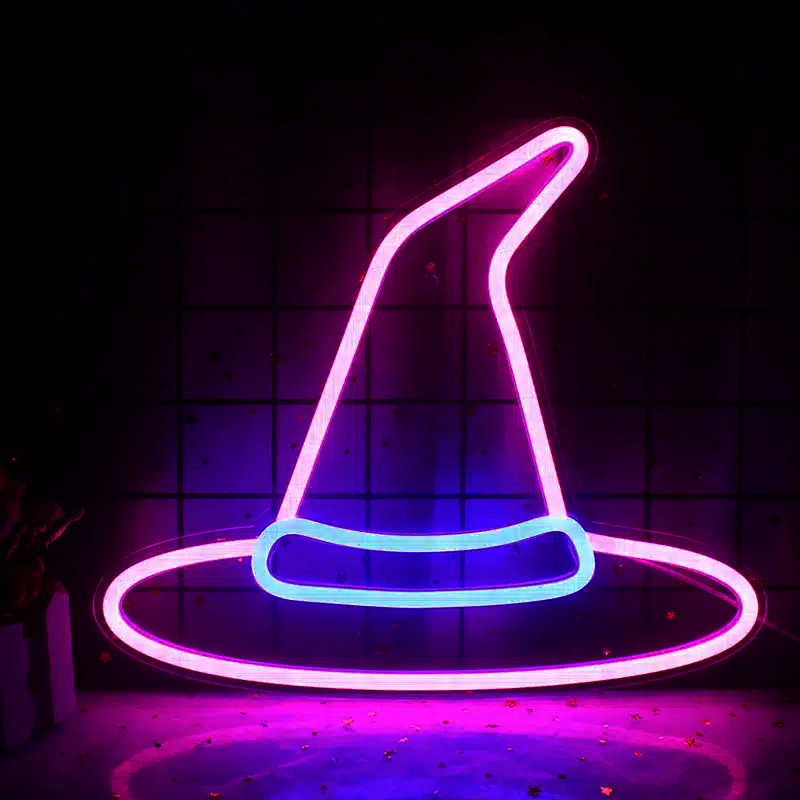 Le Neon chapeau sorcière se présente sous la forme d’un chapeau de sorcière avec une grande pointe courbée vers la droite.