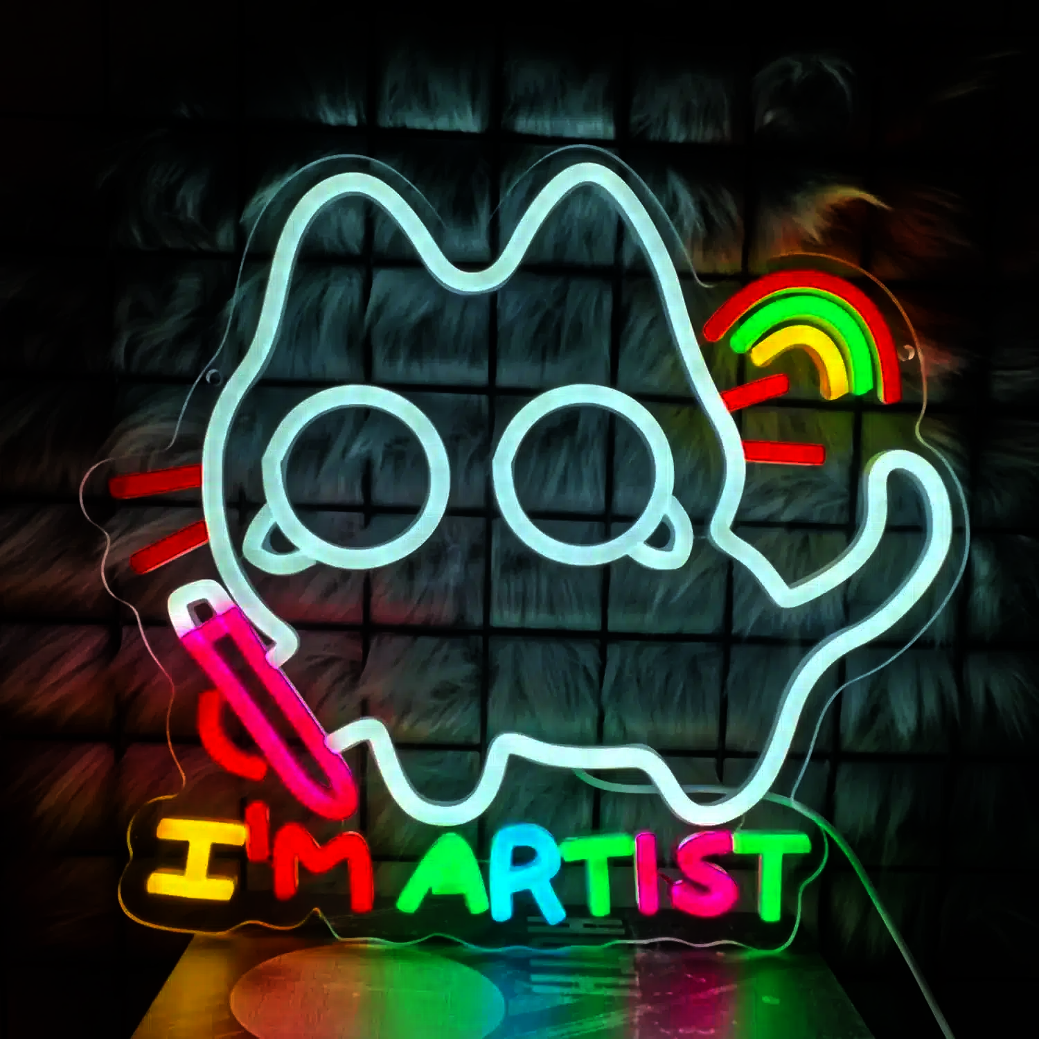 Le Néon Chat I’m Artist représente un adorable chat blanc aux contours lumineux, accompagné de l’inscription multicolore “I’m Artist” qui signifie “Je suis un artiste” en français.