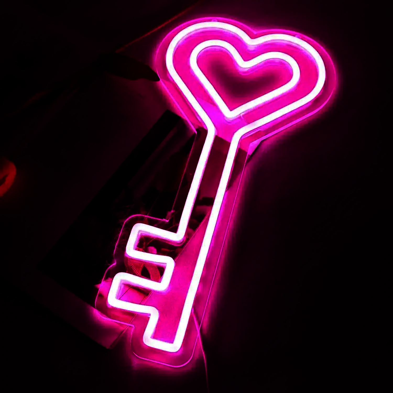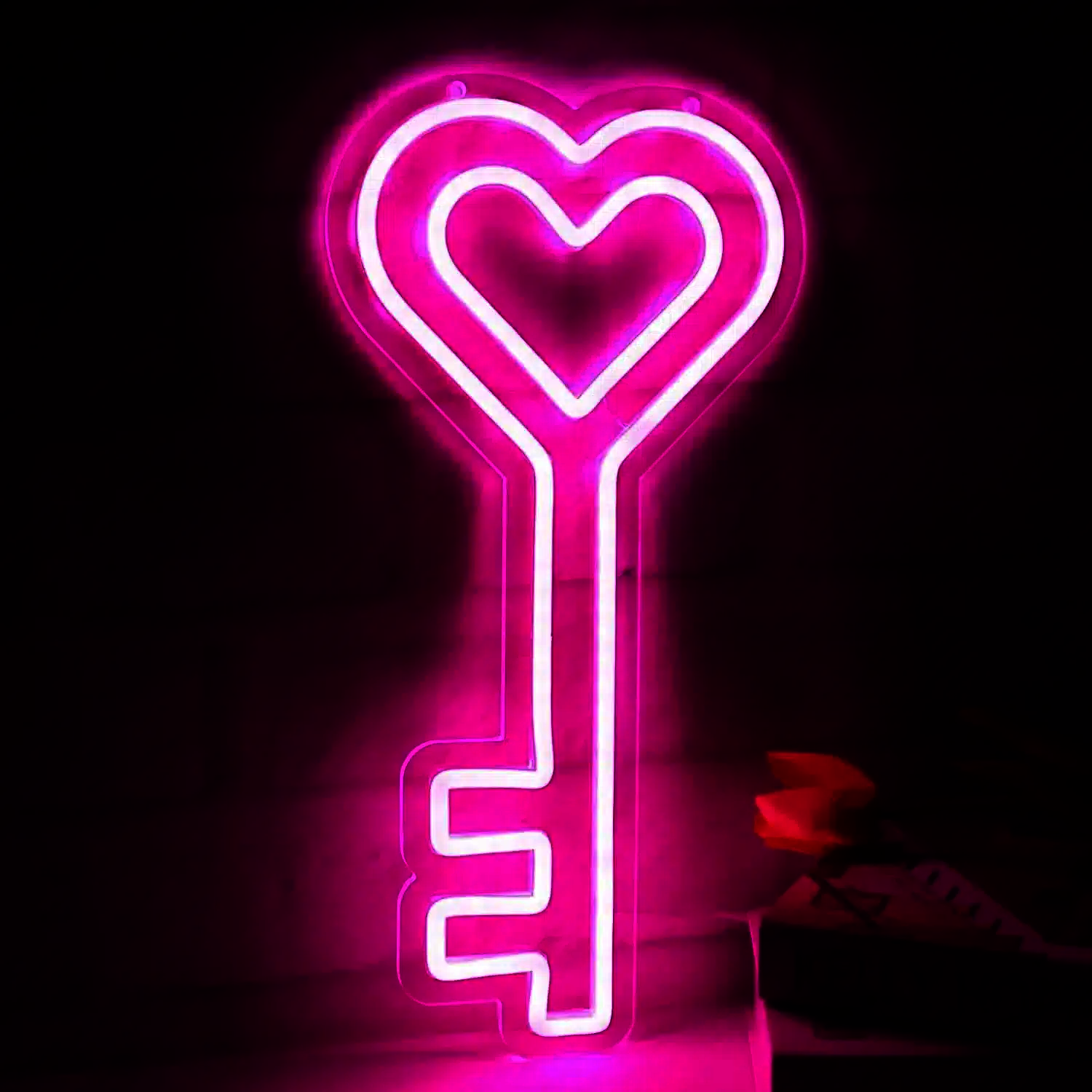 Le Néon Clé Cœur représente une clé avec un cœur double à son extrémité supérieure, entièrement illuminé en rose vif néon.