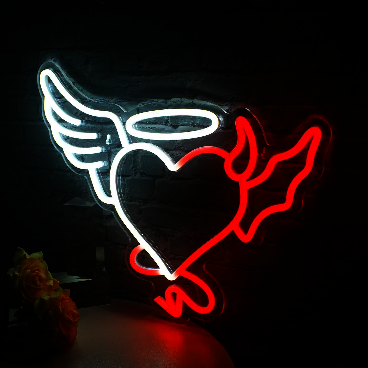 Le Néon coeur ange et démon trouverait idéalement sa place dans un salon moderne, une chambre à coucher audacieuse, ou encore dans des bars branchés et des clubs nocturnes.