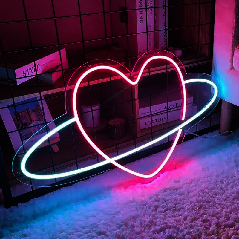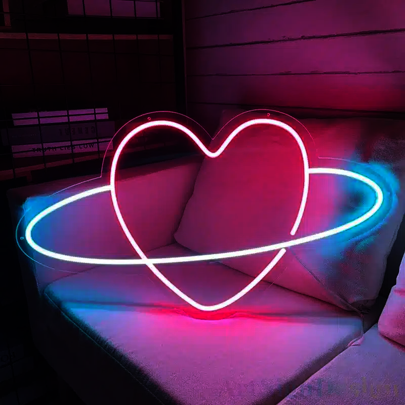Le Néon Coeur Planète Anneau présente un design romantique et cosmique.