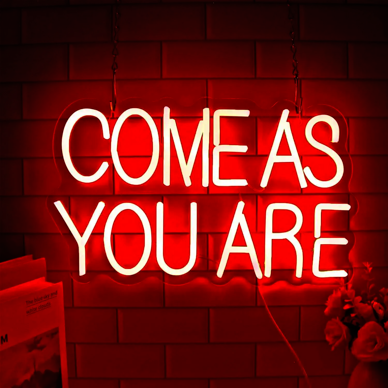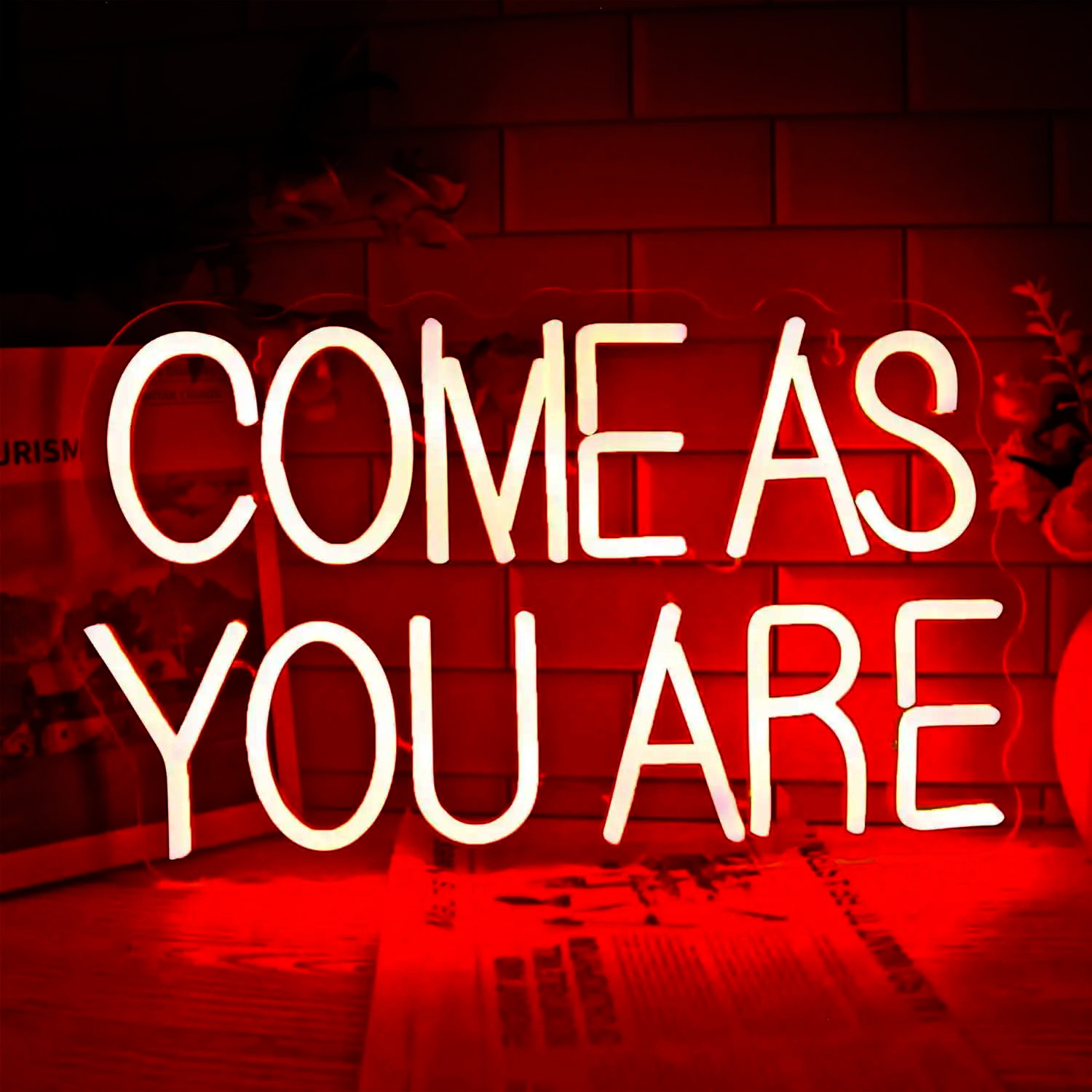 Le célèbre mantra de Nirvana “COME AS YOU ARE” immortalisé en lettres rouges lumineuses. Un hommage vibrant à l’hymne grunge qui invite à l’authenticité, parfait pour les fans de rock alternatif.