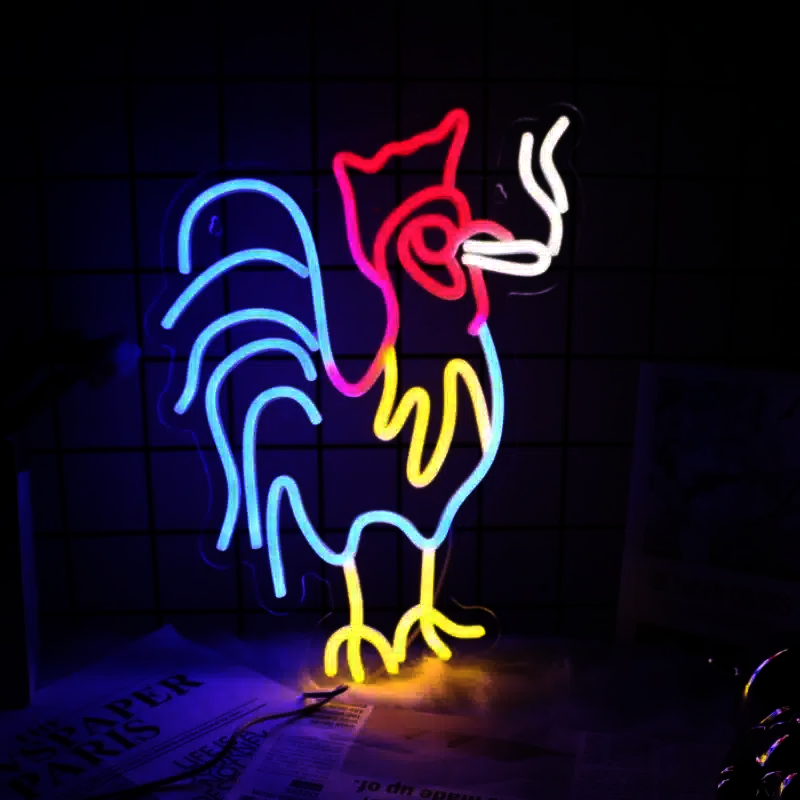 Le Néon coq Gaulois représente un gallinacé aux couleurs vives et à l’attitude inattendue.