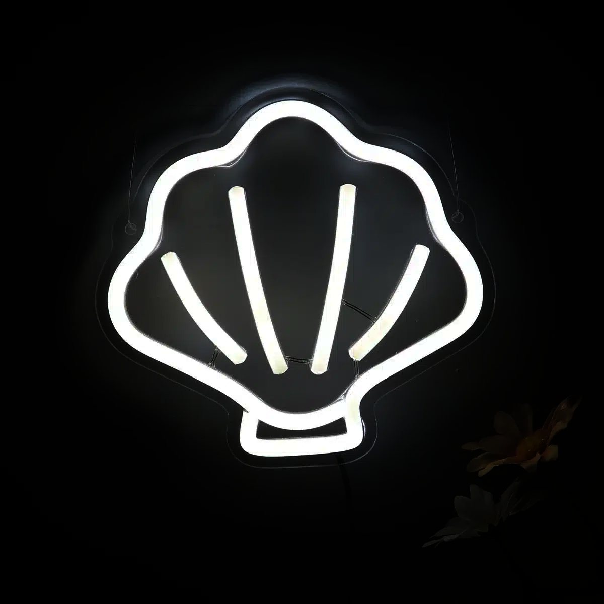 Le Néon Coquillage représente un coquillage Saint-Jacques stylisé en lumière blanche éclatante.