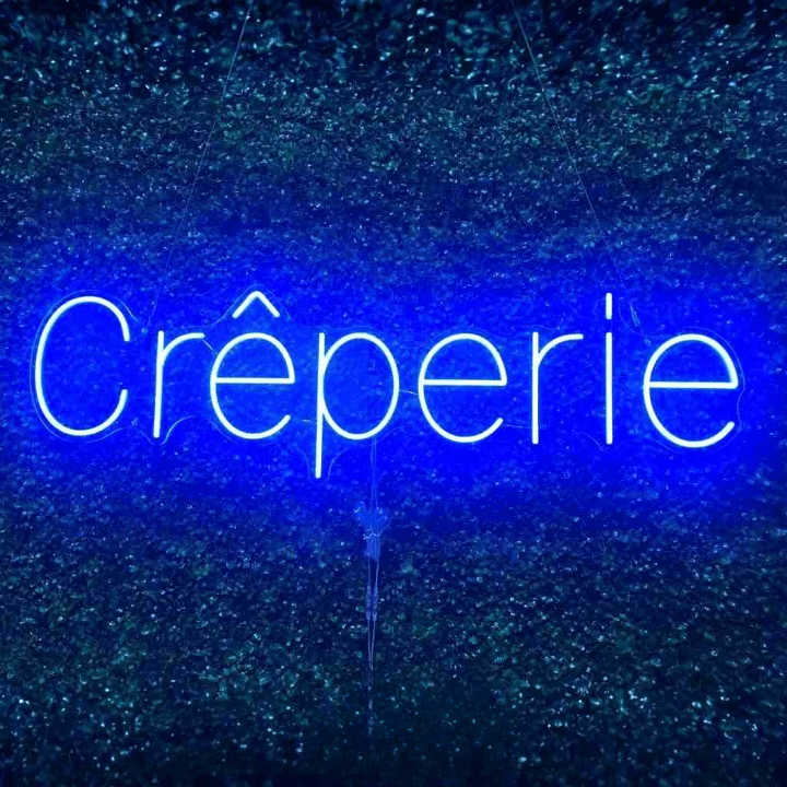 Le Néon Crêperie affiche en lettres lumineuses bleues le mot “Crêperie”, évoquant instantanément l’ambiance chaleureuse d’un restaurant spécialisé dans les crêpes.