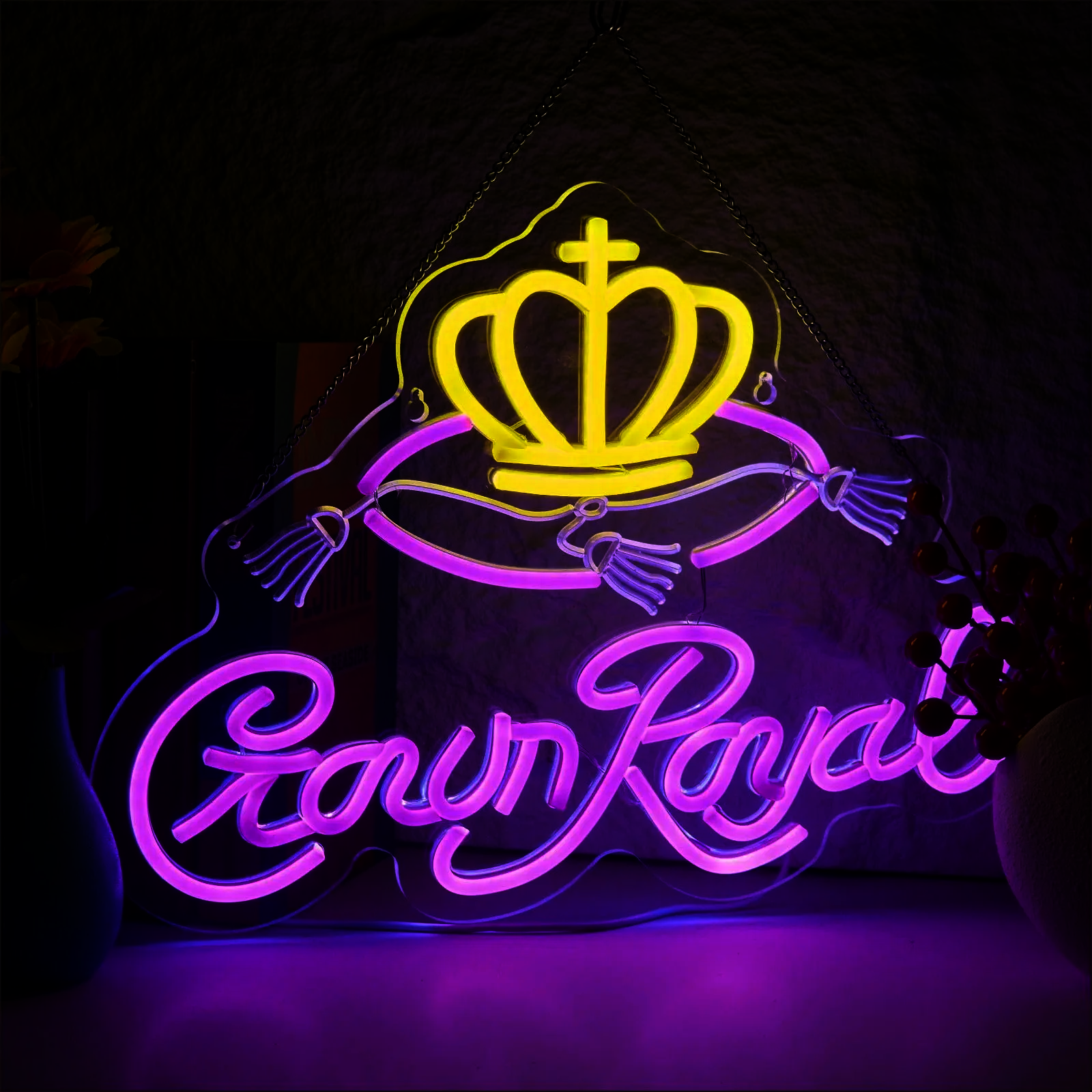 Le Néon Crown Royal représente le logo emblématique de la célèbre marque de whisky canadien Crown Royal, reconnaissable par sa couronne dorée distinctive surmontant le nom de la marque en lettres cursives élégantes.