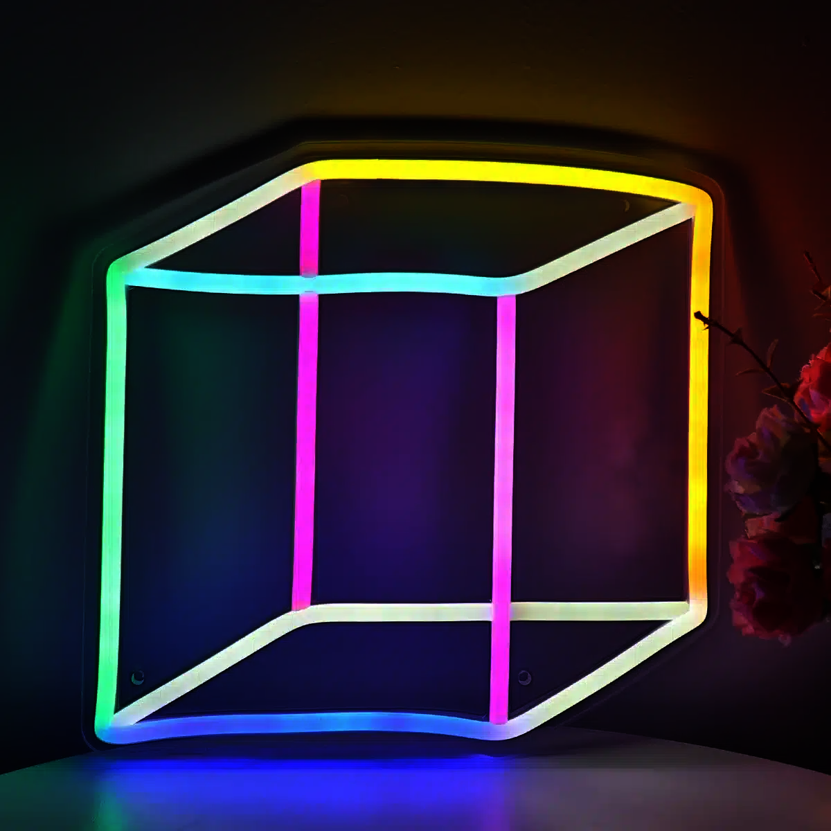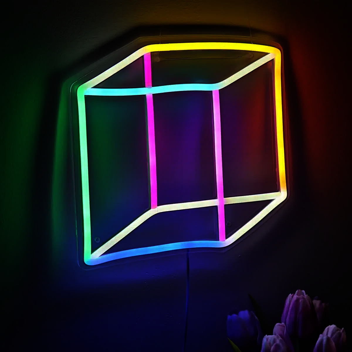 Le Néon Cube 3D représente un cube tridimensionnel, en perspective, formé par des lignes néon multicolores.