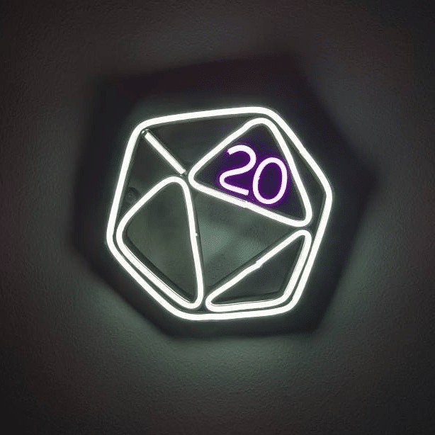 Ce néon lumineux affiche un dé blanc à plusieurs facettes, avec le chiffre 20 écrit en violet éclatant sur sa face visible.