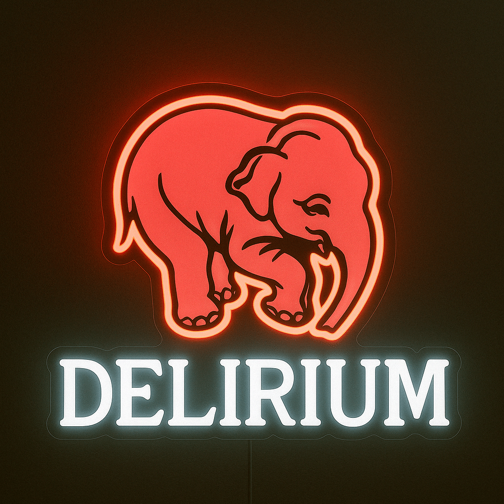 Le Néon Delirium présente un éléphant rouge stylisé au-dessus du mot “DELIRIUM” en lettres blanches lumineuses.