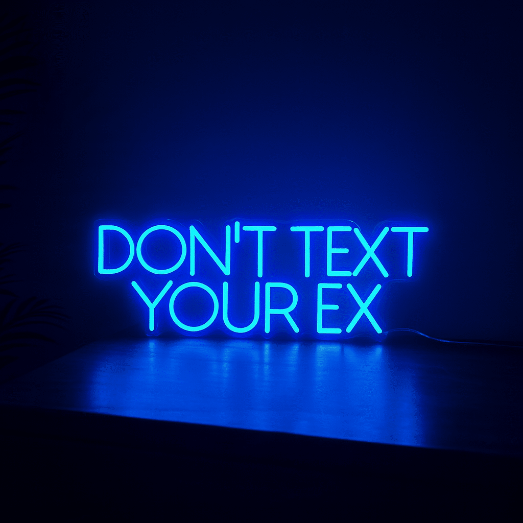 Le Néon Don’t Text Your Ex affiche un message d’avertissement moderne en lettres bleues lumineuses sur fond sombre.