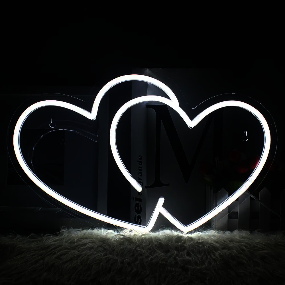 Ce néon se compose de deux contours de cœur en lumière blanche brillante, fusionnés de manière à ce que le côté droit du cœur de gauche se mêle harmonieusement au côté gauche du cœur de droite.