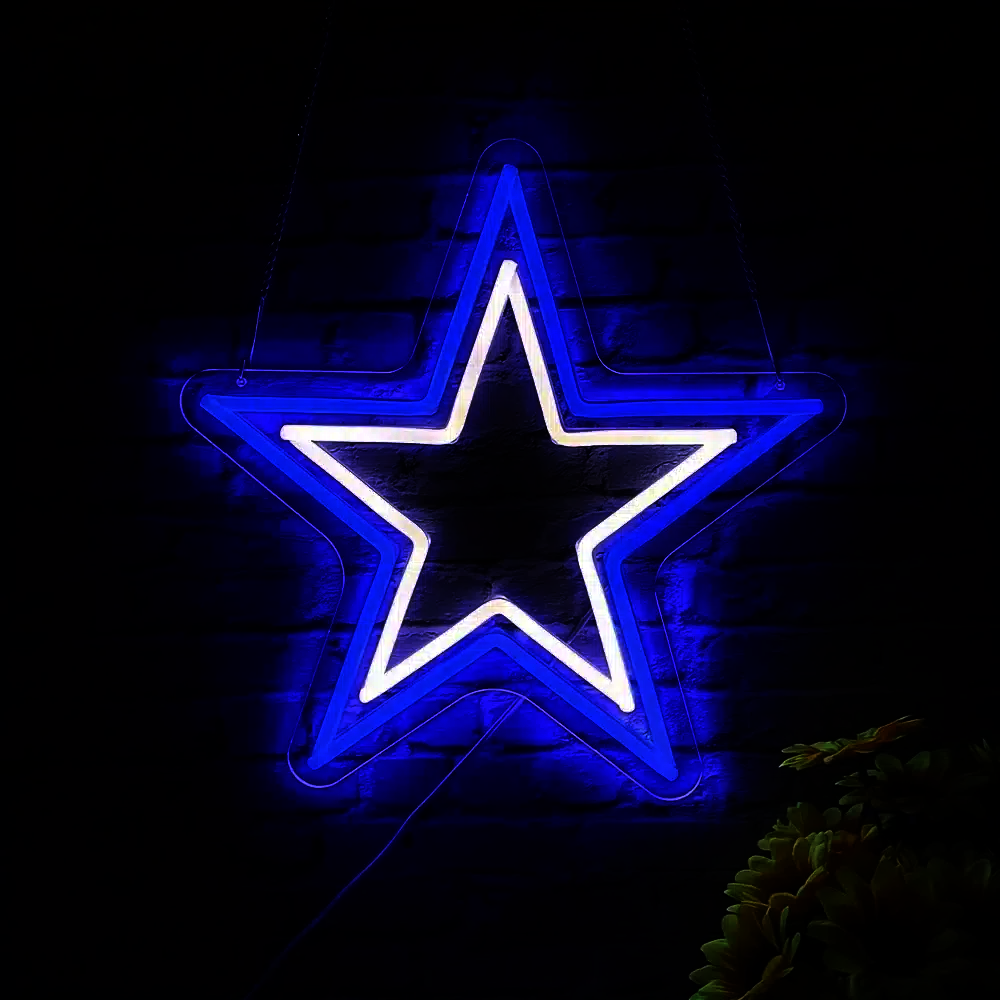 Le neon Double Étoile incarne une étoile lumineuse à cinq branches, mise en valeur par deux contours brillants qui accentuent sa présence.