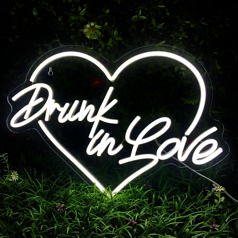 Le Néon Drunk In Love représente un cœur lumineux avec l’inscription “Drunk in Love” (signifiant “Ivre d’amour” en français) à l’intérieur.