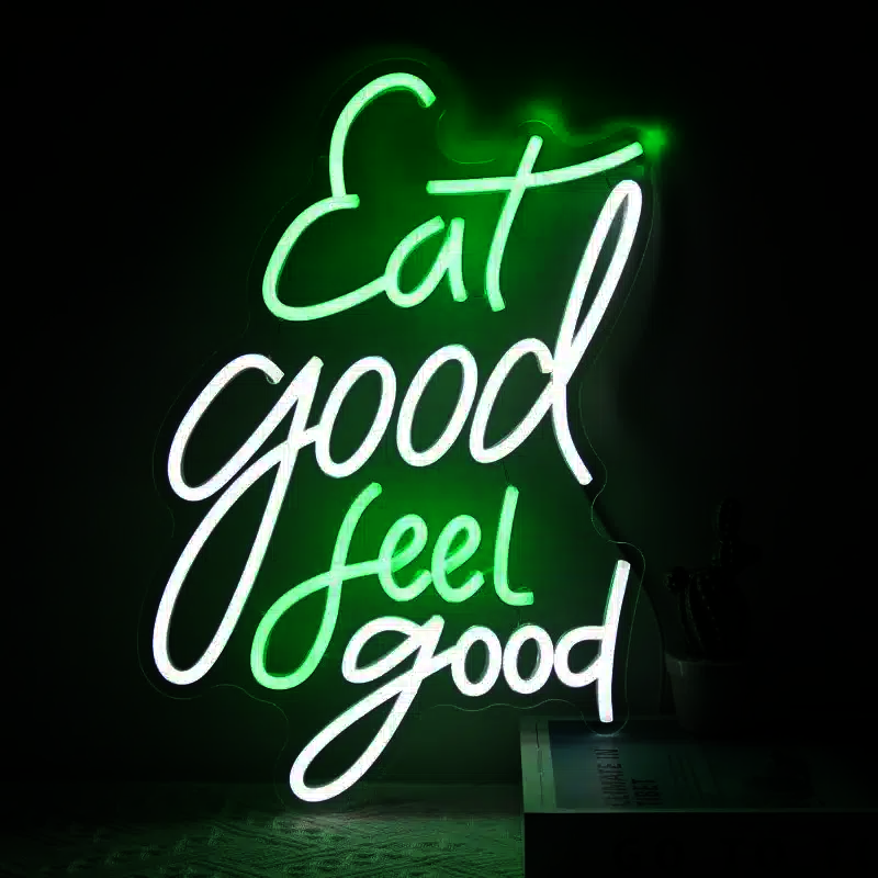 Ce néon décoratif combine un message de bien-être et d’alimentation saine avec un design moderne et attrayant. Les mots “Eat” et “Feel” sont écrits en plus grand format, tandis que les deux “good” apparaissent en taille légèrement réduite, créant un rythme visuel agréable.