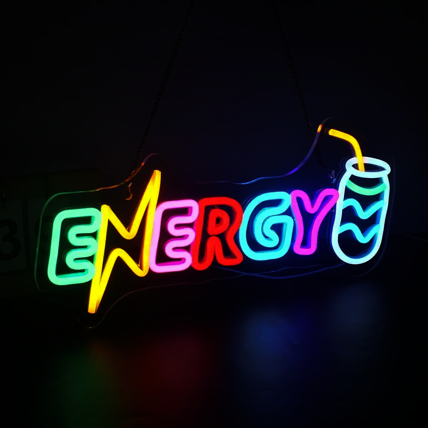 Le Néon Energy représente le mot “ENERGY” écrit en lettres lumineuses multicolores, accompagné d’un symbole d’éclair et d’une boisson énergisante.