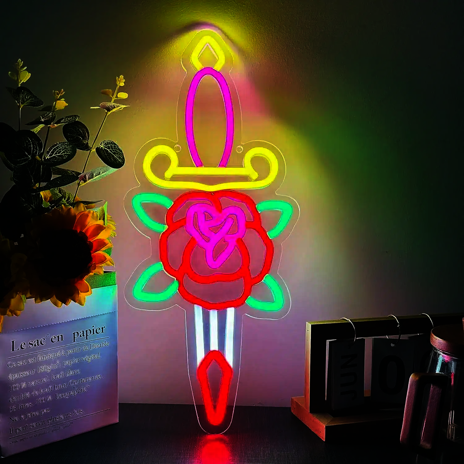 Ce Néon Épée Rose Rouge trouve parfaitement sa place dans une chambre, un salon de tatouage, ou un espace dédié aux jeux vidéo.